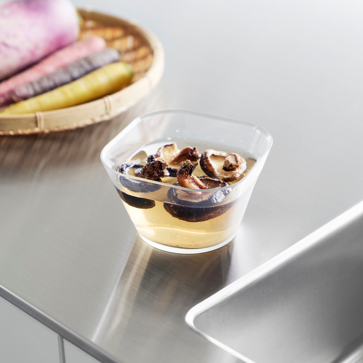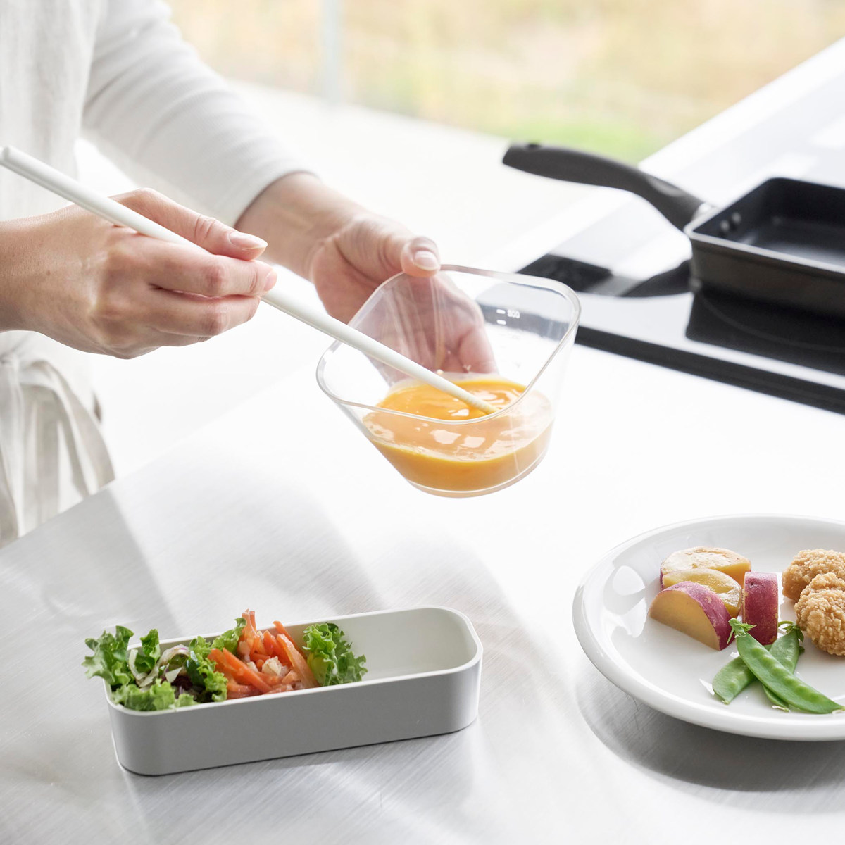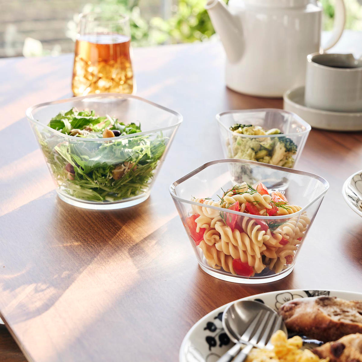 ガラスのような透明感で、食卓にそのまま器としても出せるデザインです。調理をしてから食器として使えるので、洗い物を減らすことができます。