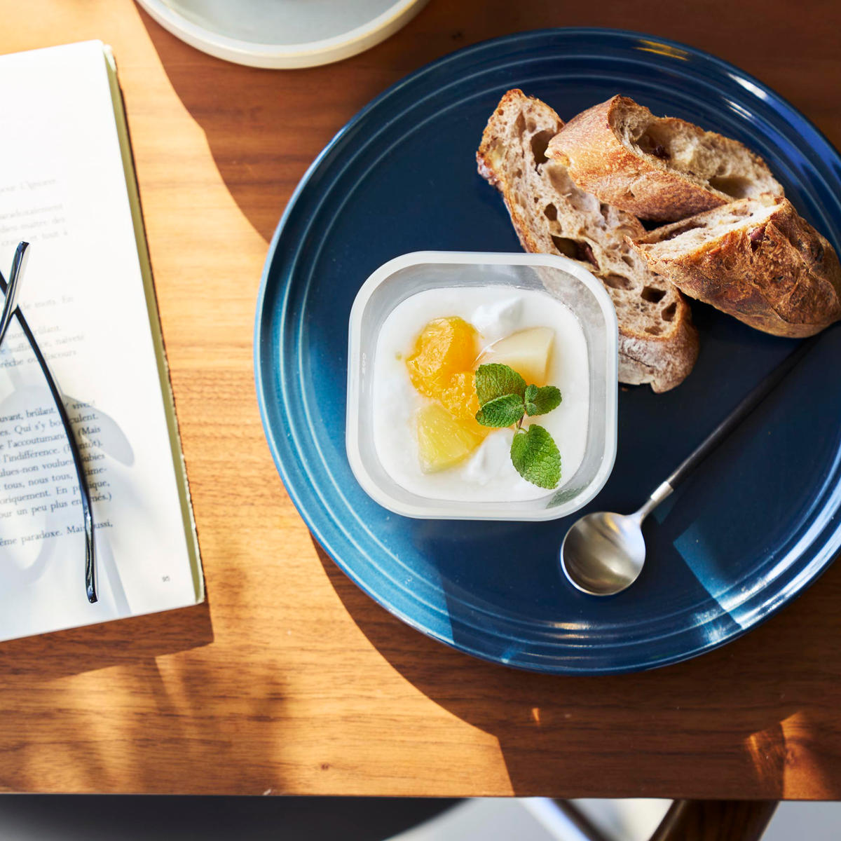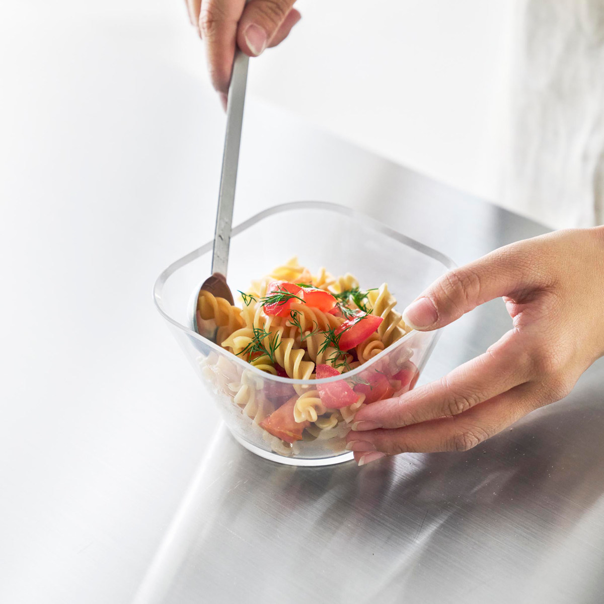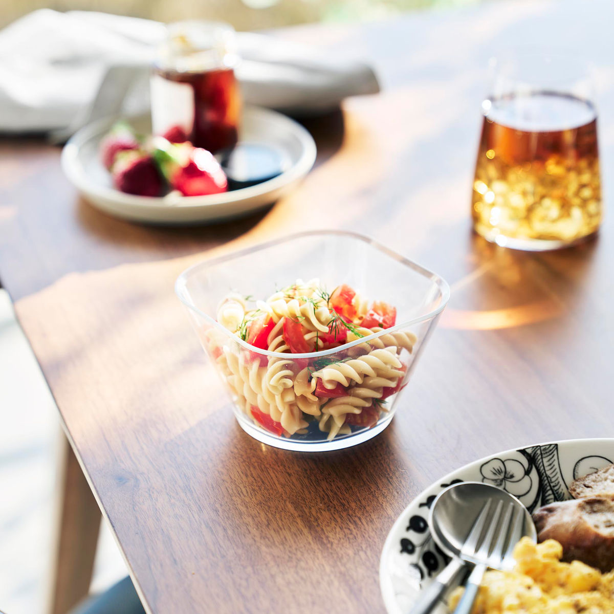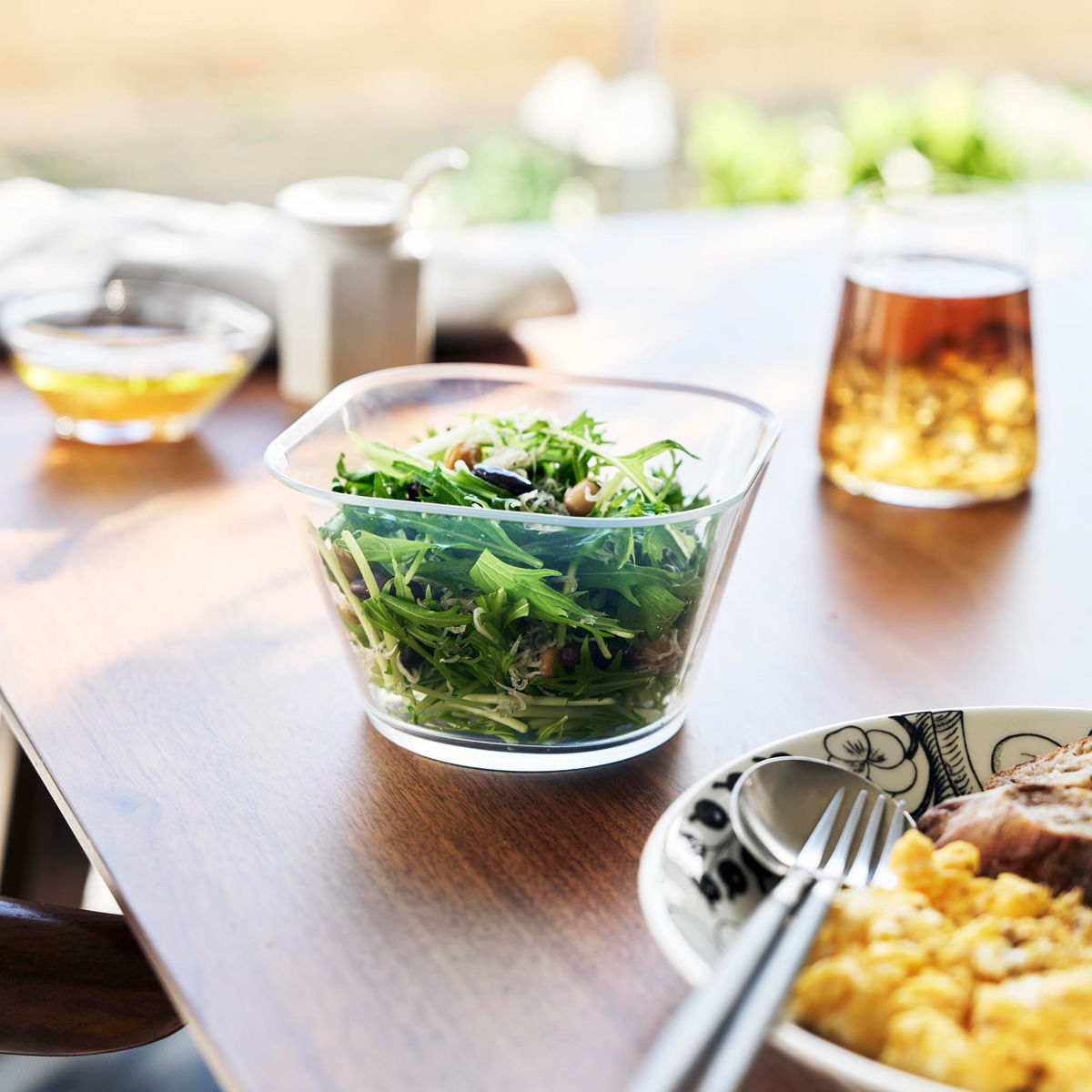 ガラスのような透明感で、食卓にそのまま器としても出せるデザインです。調理をしてから食器として使えるので、洗い物を減らすことができます。