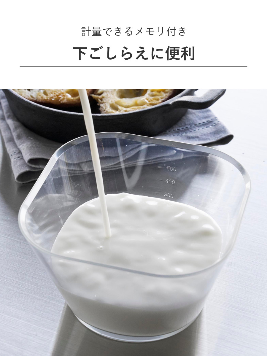 軽くて扱いやすく、メモリ付きで計量ができる下ごしらえに便利なボウルです。片手で持ちやすく注ぎやすい形状で水切れがよく、自家製ドレッシング作りや出汁作りなどにも便利です。