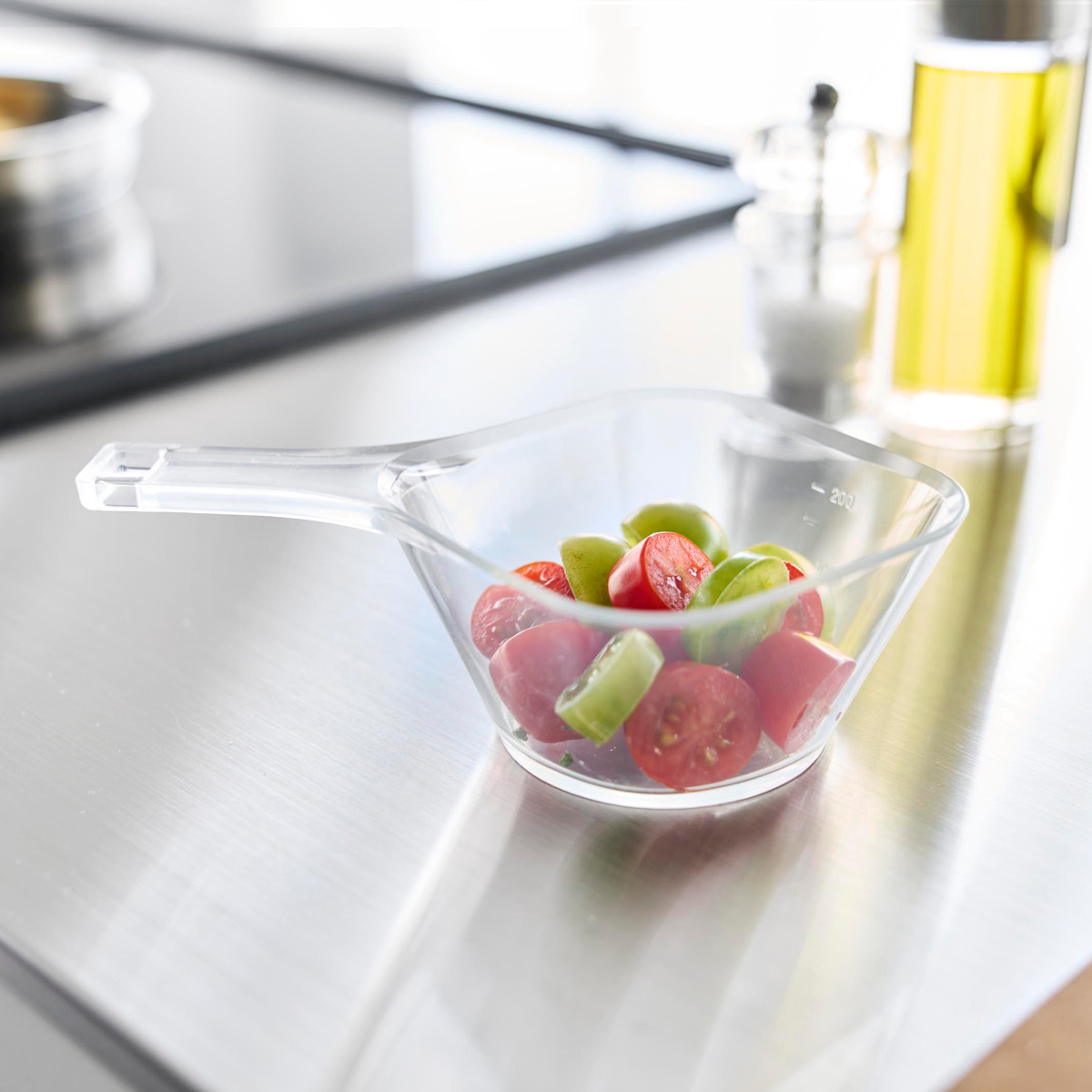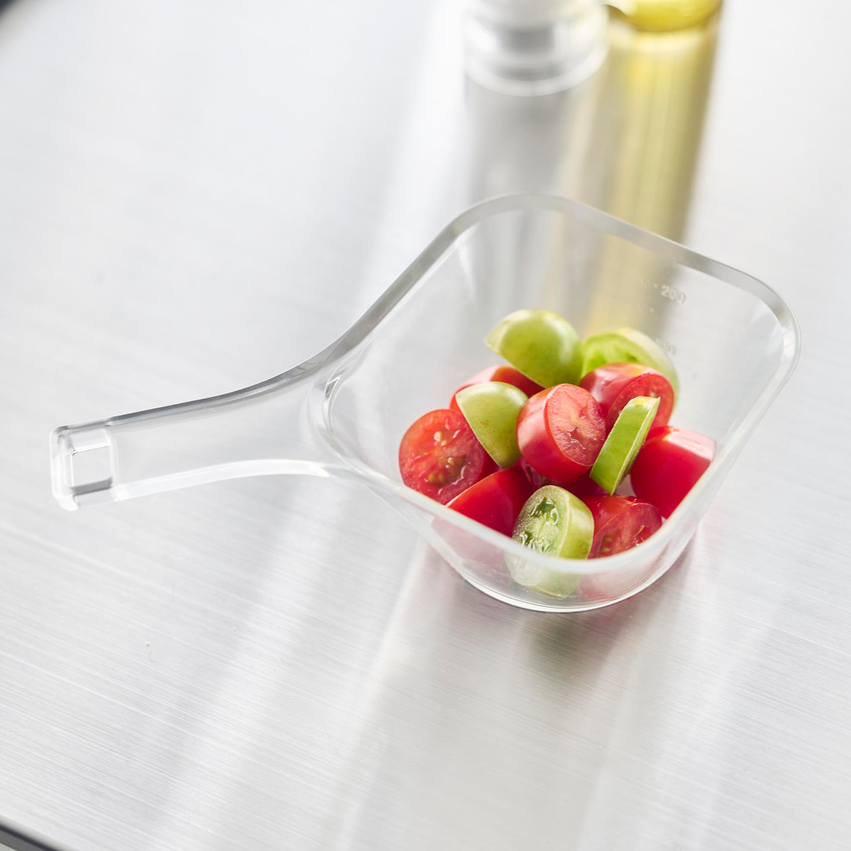 軽くて扱いやすく、メモリ付きで計量ができるハンドル付きのボウルSサイズです。片手で持ちやすく注ぎやすい形状で水切れがよく、自家製ドレッシング作りや出汁作りなどにも便利です。
