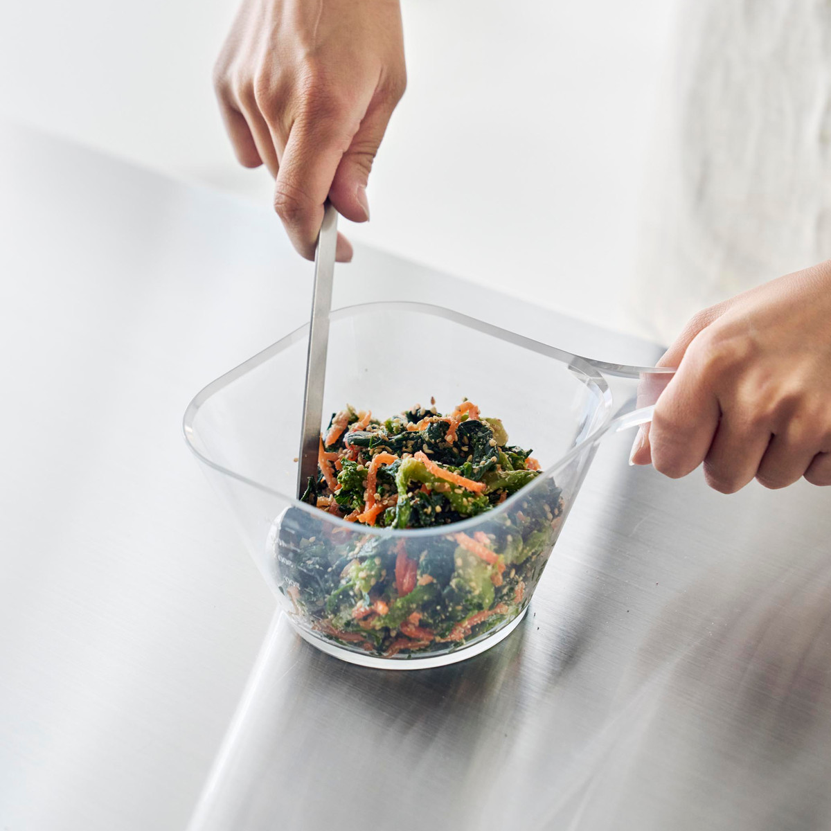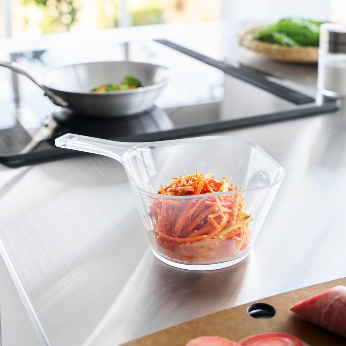 軽くて扱いやすく、メモリ付きで計量ができるハンドル付きのボウルLサイズです。片手で持ちやすく注ぎやすい形状で水切れがよく、自家製ドレッシング作りや出汁作りなどにも便利です。