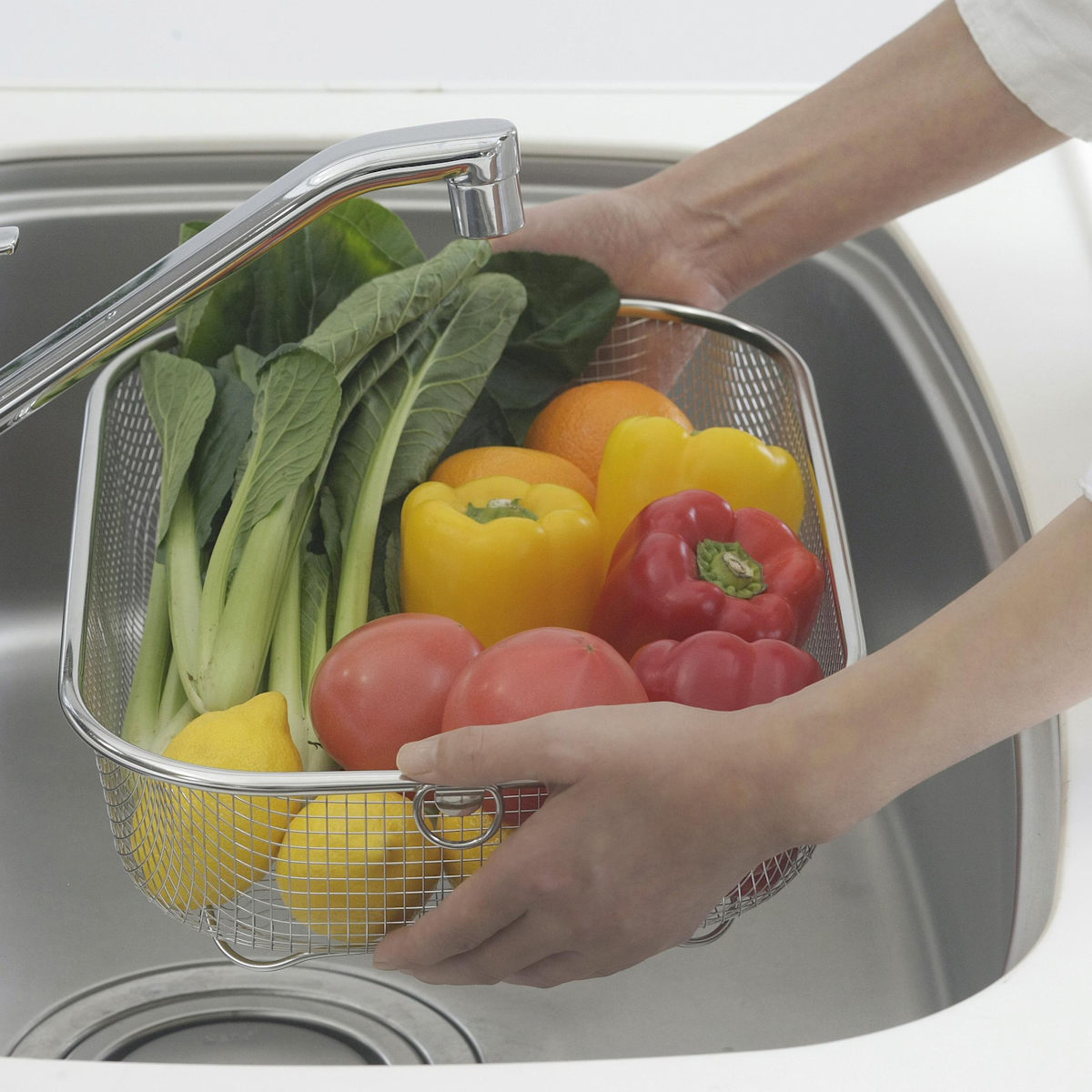仕切りが無いので、野菜や果物などの食材を洗いたいときにも使えて重宝します。脚付きなので、ザルの下部分は空気の通りが良く、通気性もいいので水切りに最適なアイテムです。