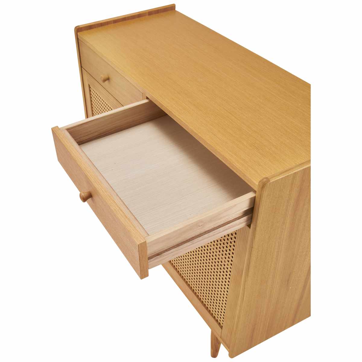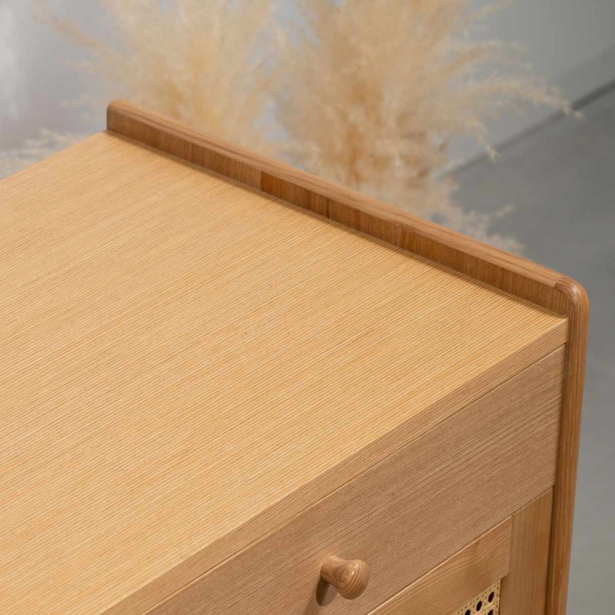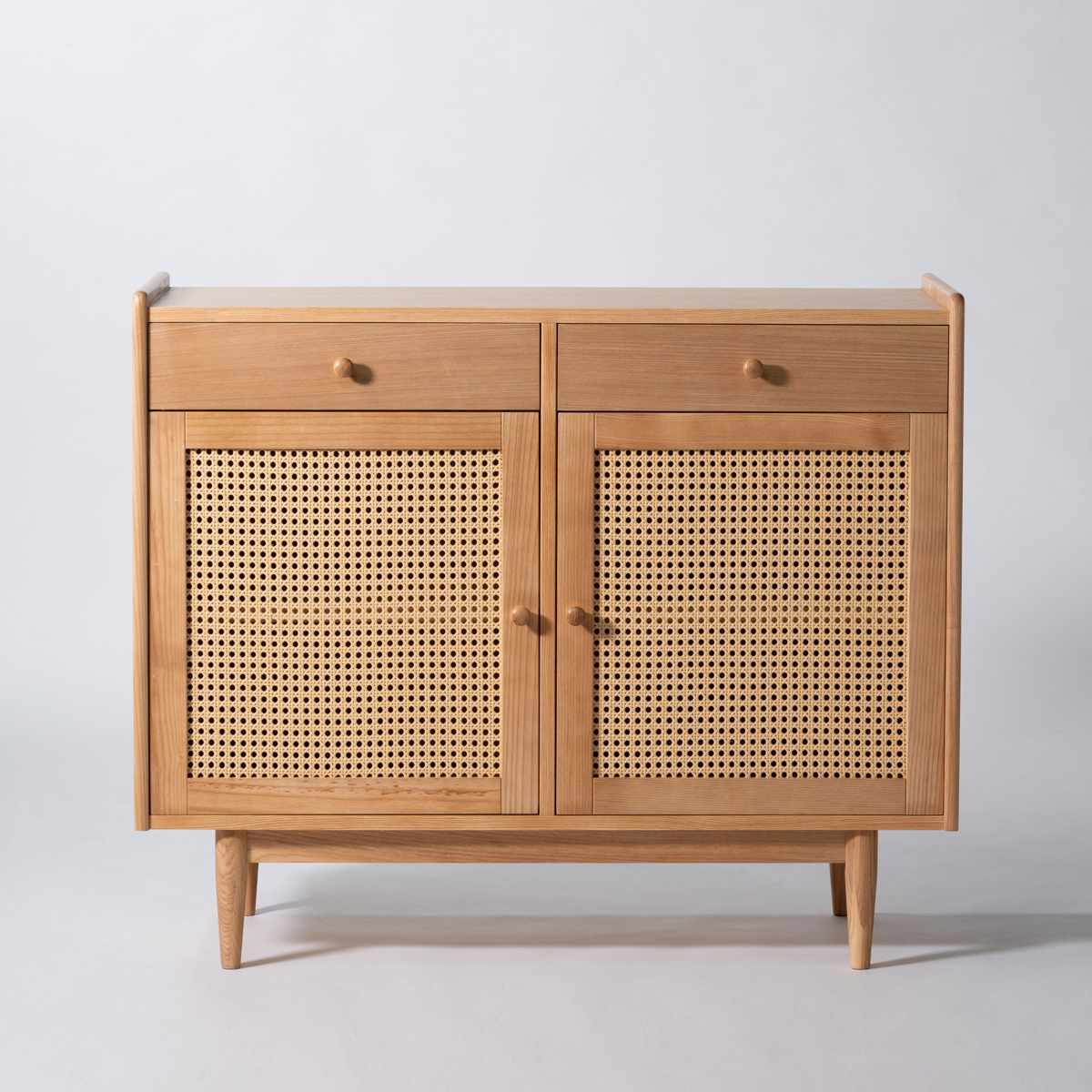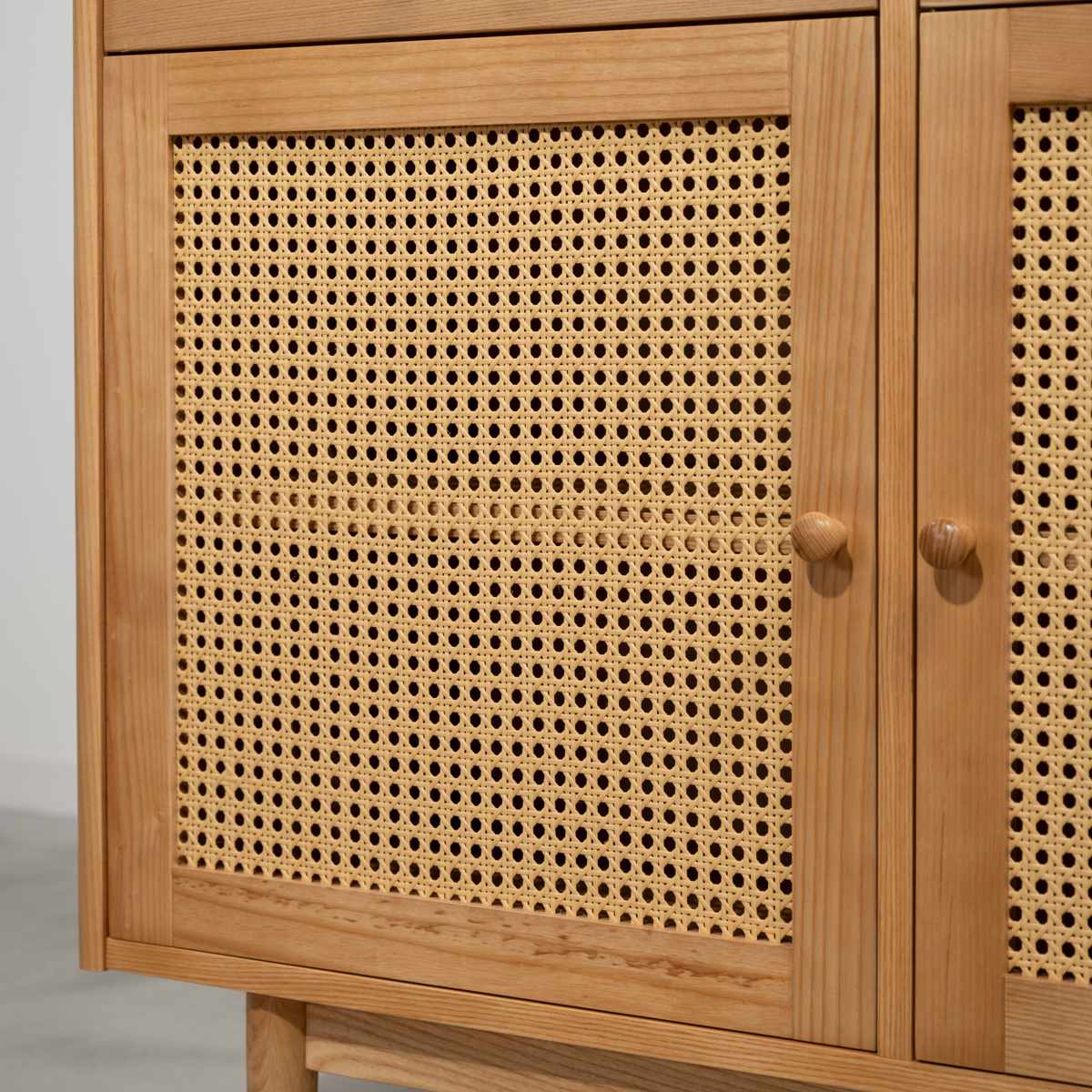 お部屋にひとつ配置するだけで印象をがらりと変えてくれるキャビネットです。木目の美しいアッシュ材に人工ラタンを採用することで、ナチュラルであたたかみのある仕上がりに。和モダンやリゾート風のテイストなど、凛とした爽やかさと上品さのある空間を演出します。