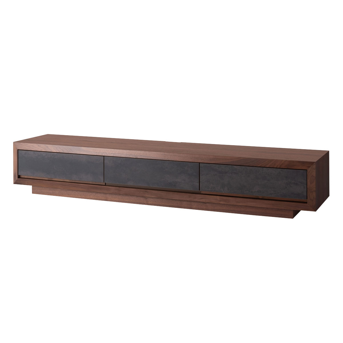 天然木の木目を活かしたデザインの本体に、石目調の引き出しと扉がアクセントのローボードです。ロータイプ仕様で、重厚感のある雰囲気を演出しています。