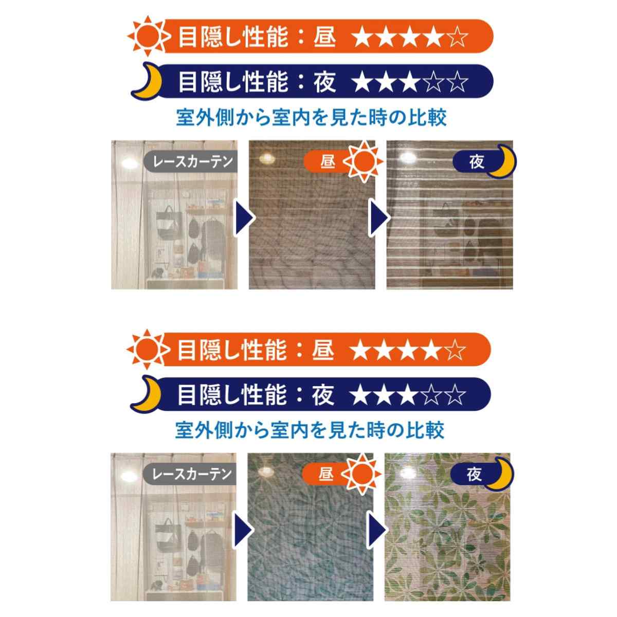 日中は外からの視線をしっかり遮り、快適で安心な空間で過ごせます。夜間もレースカーテンとの併用で丸見えになることはなく、目隠し効果が期待できます。
