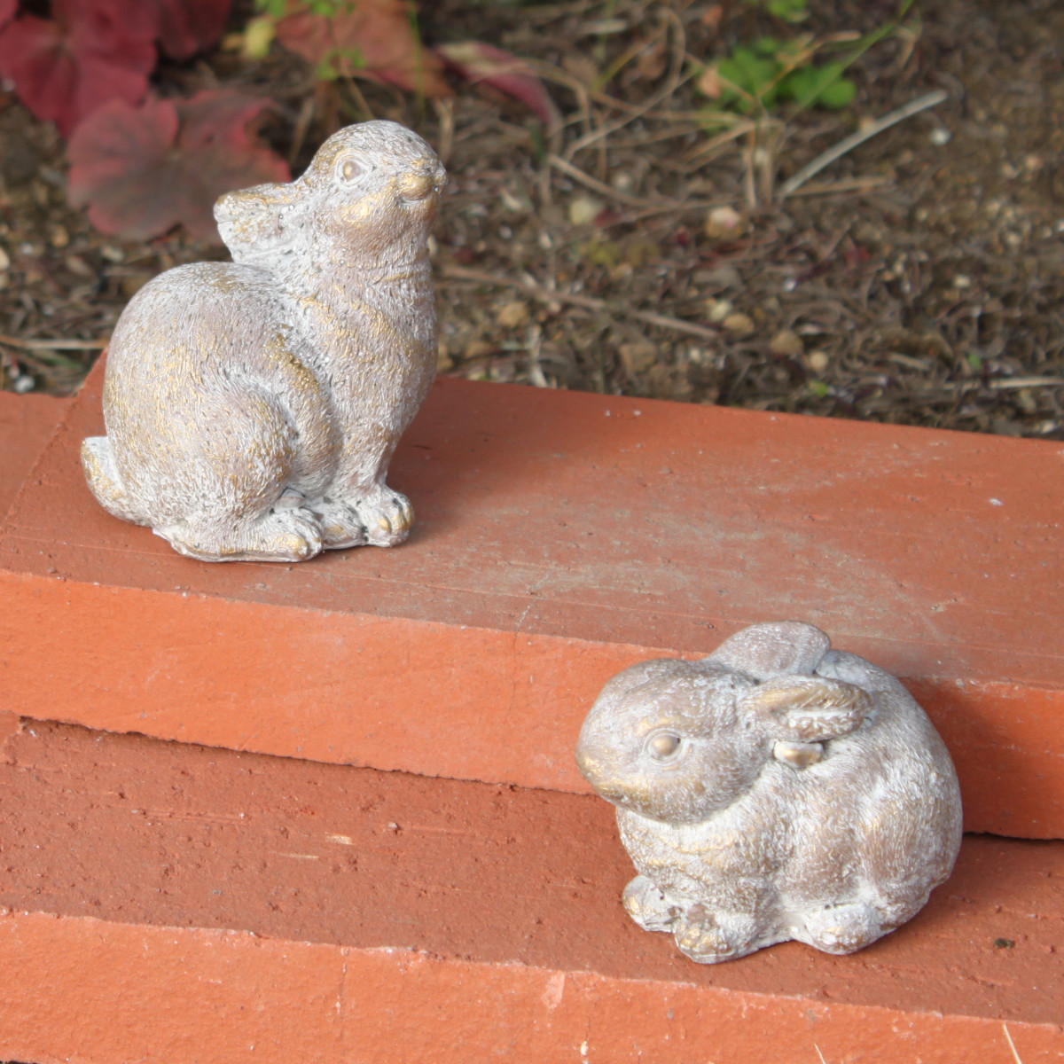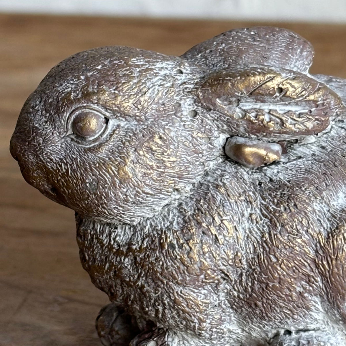 かわいらしいうさぎをモチーフにしたガーデンオーナメントです。セメントならではの重厚感とアンティーク調のゴールドの風合いが、ナチュラルで落ち着いた存在感を演出します。