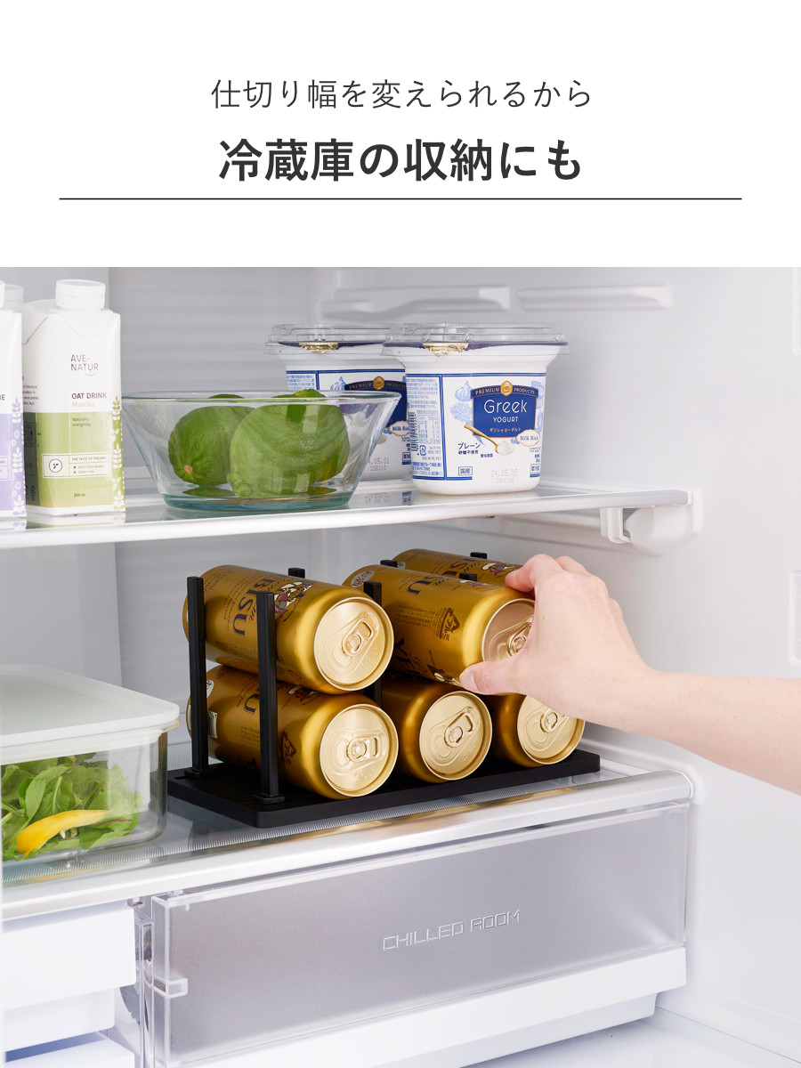 仕切りは収納物のサイズに合わせて調節できます。好みの位置にスライドしてロックするだけで、幅広い収納に使えます。