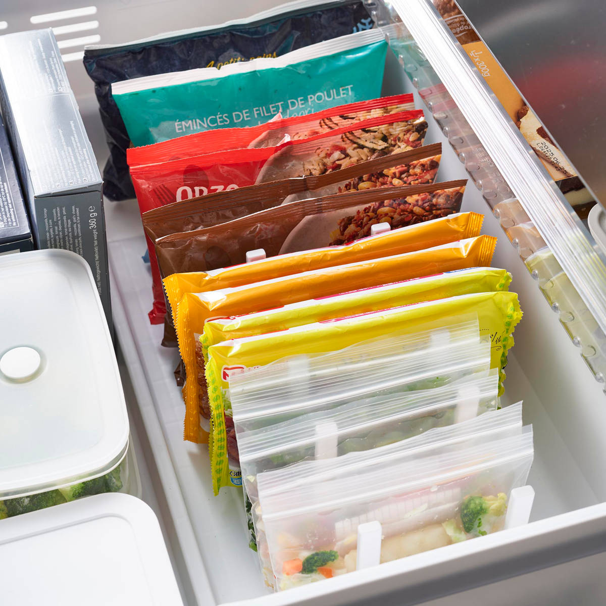 冷凍庫の食品を立てて整理できる冷凍庫中収納スタンドです。1つ1つ立てて収納することで使いたいものをサッと取り出しやすくなります。