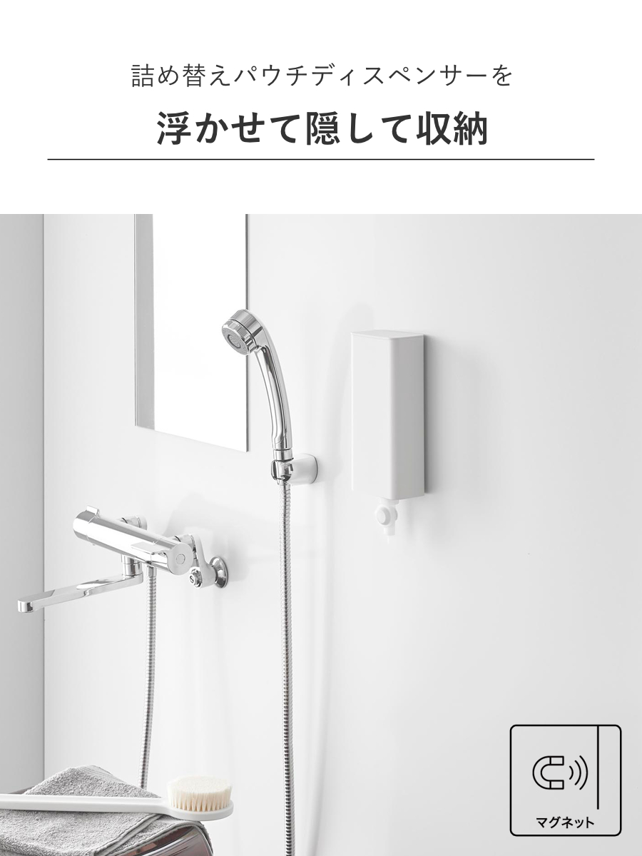 マグネットで簡単取り付けできるSサイズの収納ホルダーです。生活感のある詰め替えパウチディスペンサーを隠してすっきり収納できます。