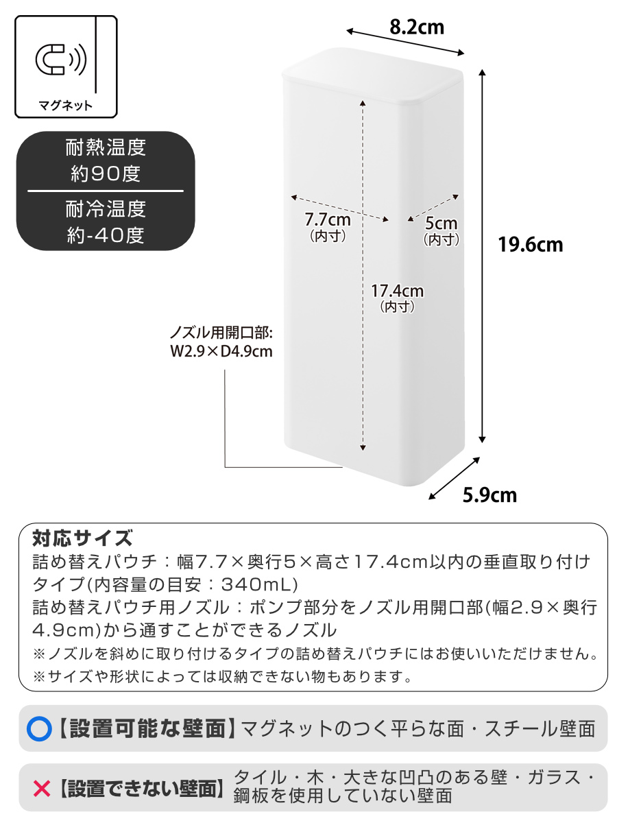 | 対応サイズ | 詰め替えパウチ:幅7.7×奥行5×高さ17.4cm以内の垂直取り付けタイプ(内容量の目安:340mL) 詰め替えパウチ用ノズル:ポンプ部分をノズル用開口部(幅2.9×奥行4.9cm)から通すことができるノズル ※ノズルを斜めに取り付けるタイプの詰め替えパウチにはお使いいただけません。 ※サイズや形状によっては収納できない物もあります。 |