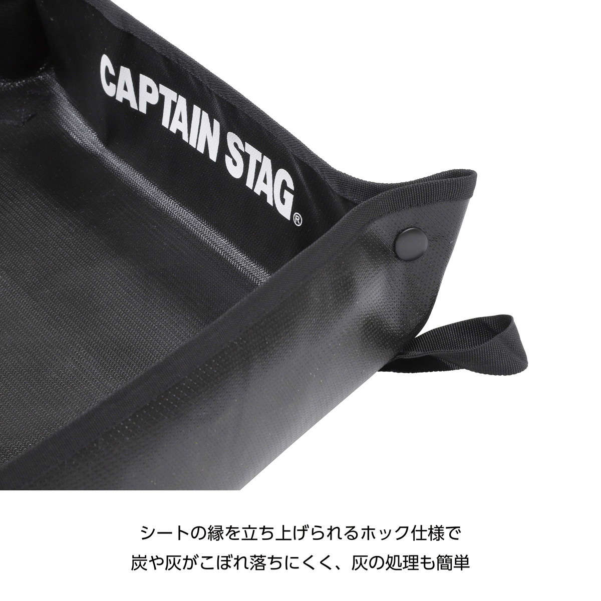 シートの縁を立ち上げて留められるホック仕様です。落ちた灰が風に吹かれて散らかるのを防ぎ、焚火終わりの片付けもラクになります。