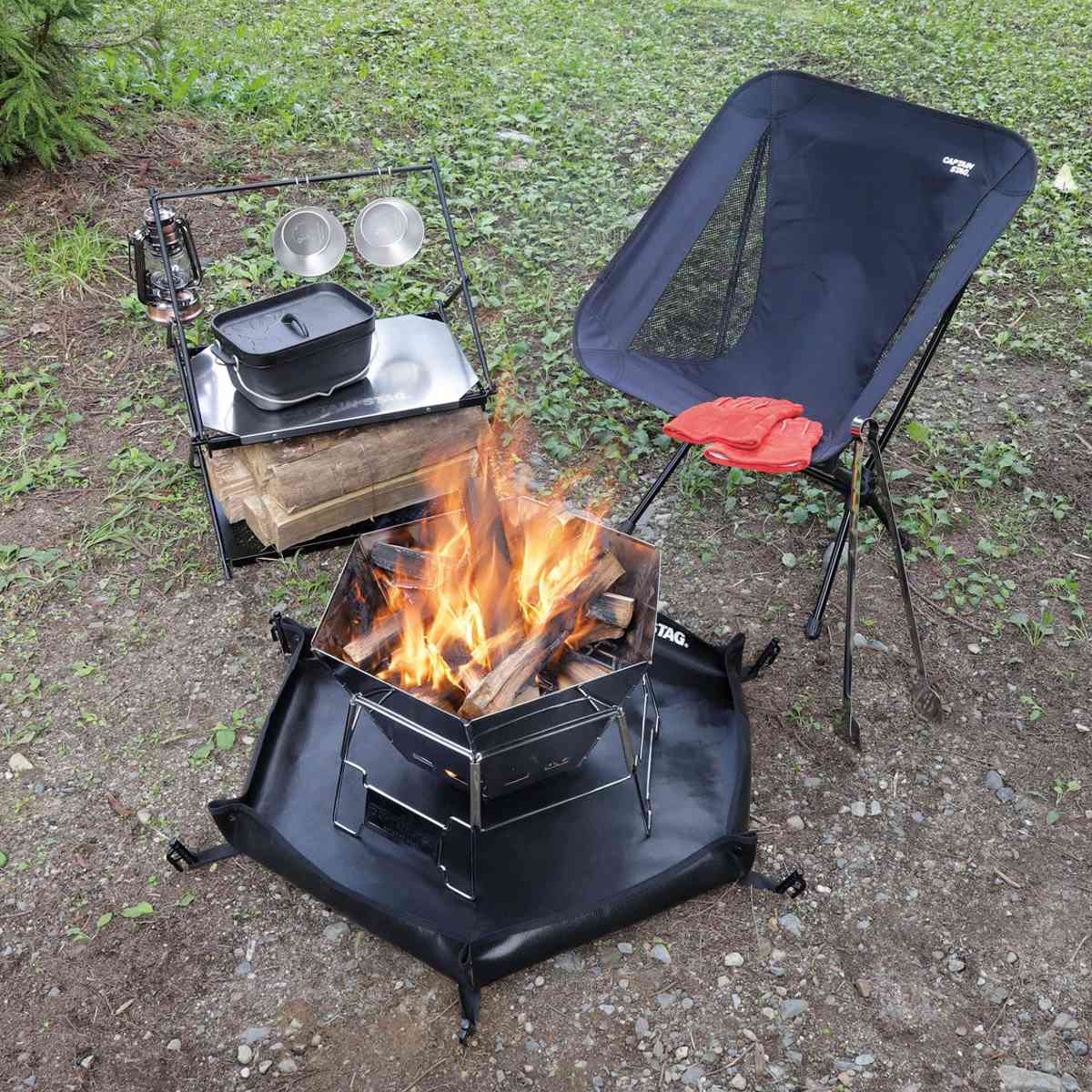 焚火などの熱を遮断し、地面へのダメージを軽減する耐火シートです。縁が自立するタイプで、灰の飛散を防ぎます。焚火台の下に敷けば、芝生の上でも安心して焚火が楽しめます。直火禁止のキャンプ場でも使える便利なアイテムです。