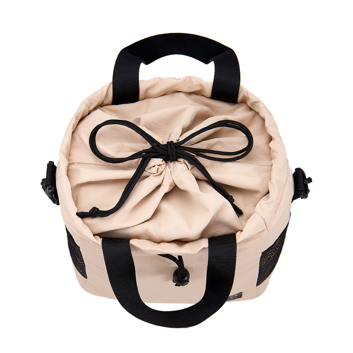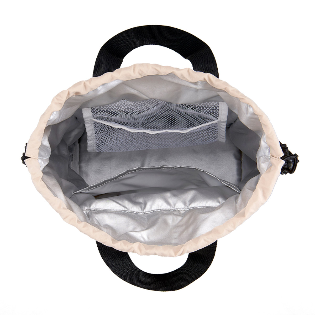 2段階の巾着使用でしっかり密封することができます。また、内側には保冷剤ポケットがついています。