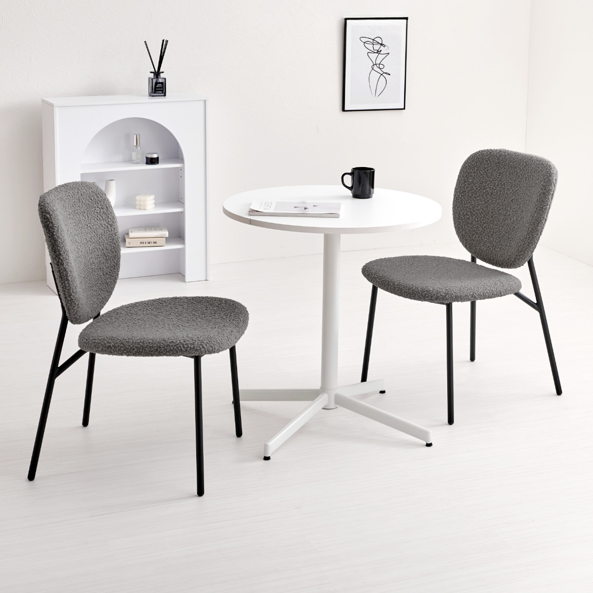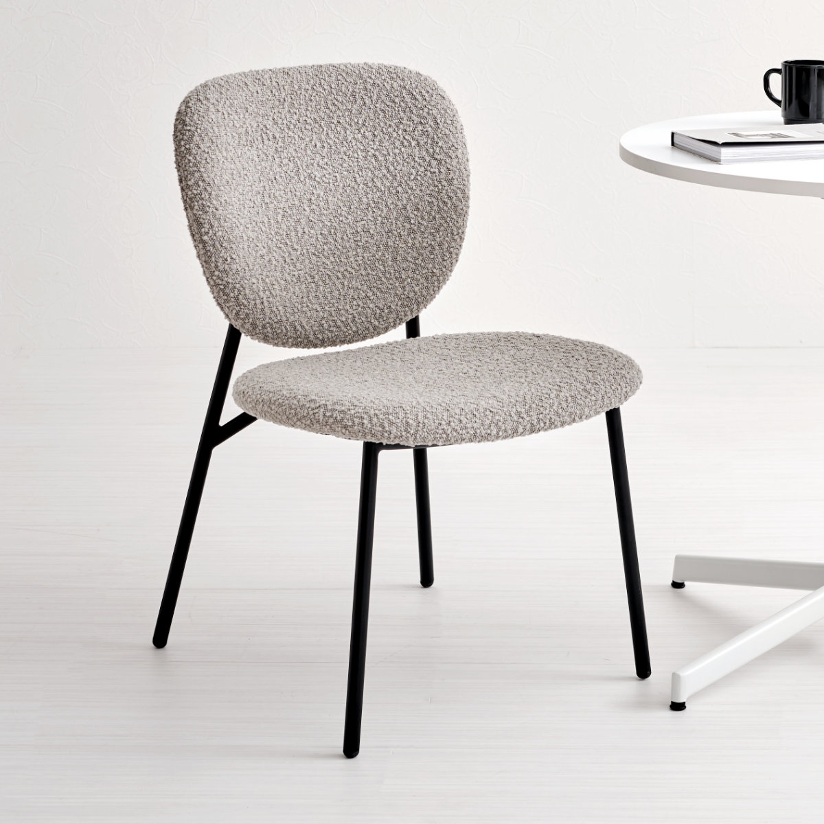 独特な質感のブークレ生地とブラックスチール脚の異素材を組み合わせたダイニングチェアです。モダンな雰囲気の中にも温かみのある空間を演出してくれます。