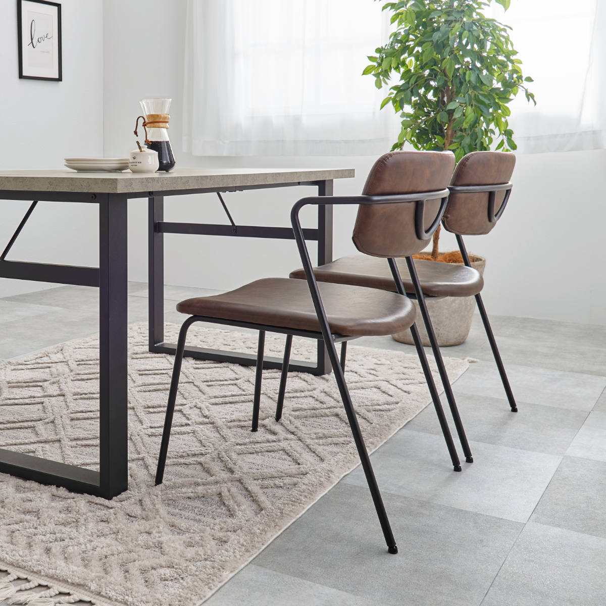 細見なシルエットで特徴的なZ型フレームとレザー調生地を使用した、スタイリッシュで目を惹くダイニングチェアです。座面や背もたれは本革のような風合いで、洗練された雰囲気を演出します。