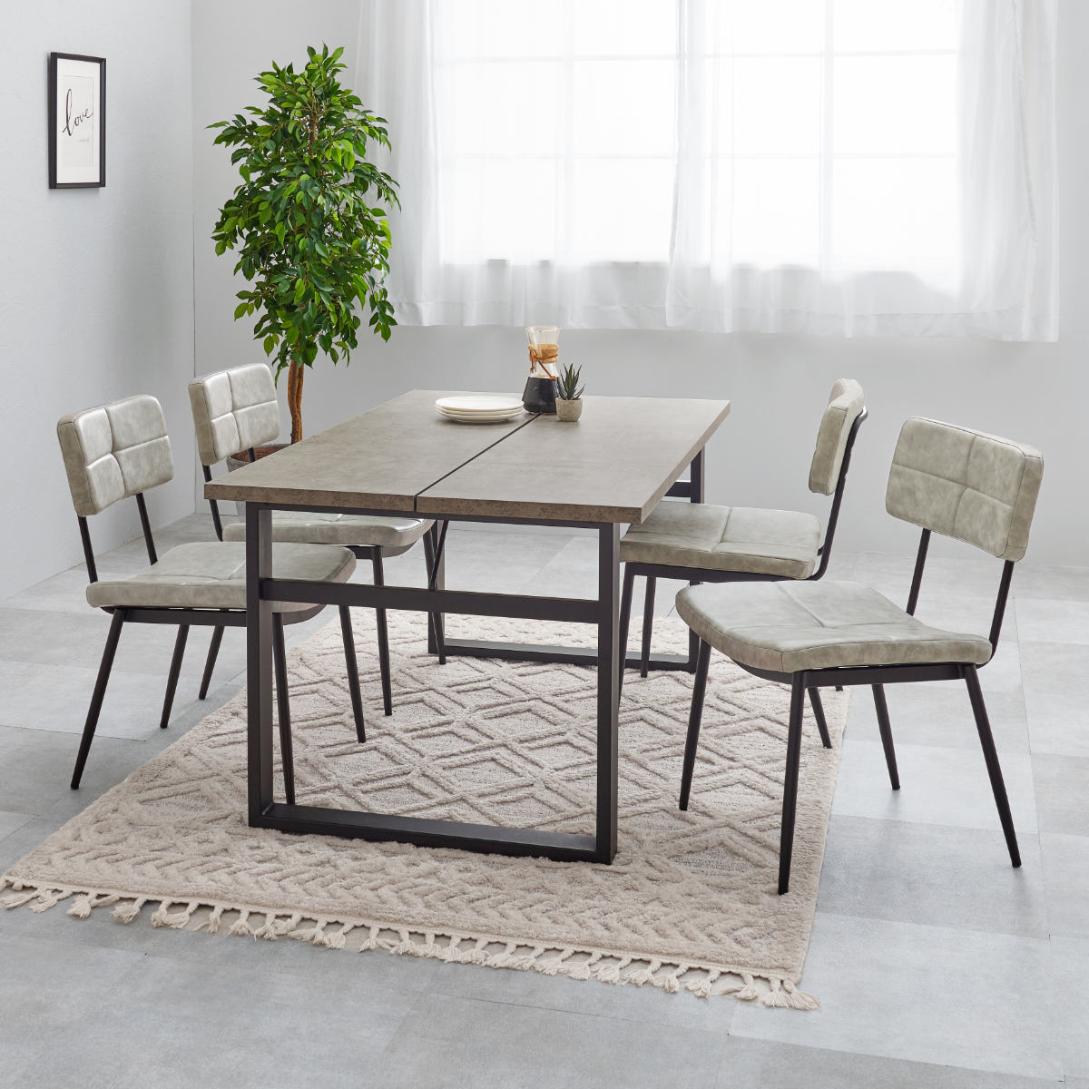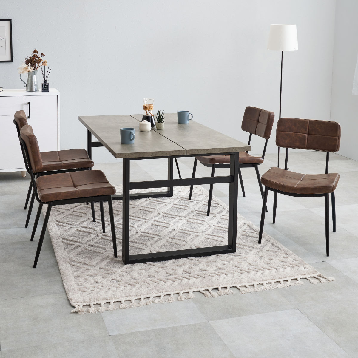 スタイリッシュなコンクリート調ダイニングテーブルと、ヴィンテージ風チェアの5点セットです。無骨な質感のテーブルと本革のような風合いの椅子がマッチし、洗練された雰囲気を演出します。