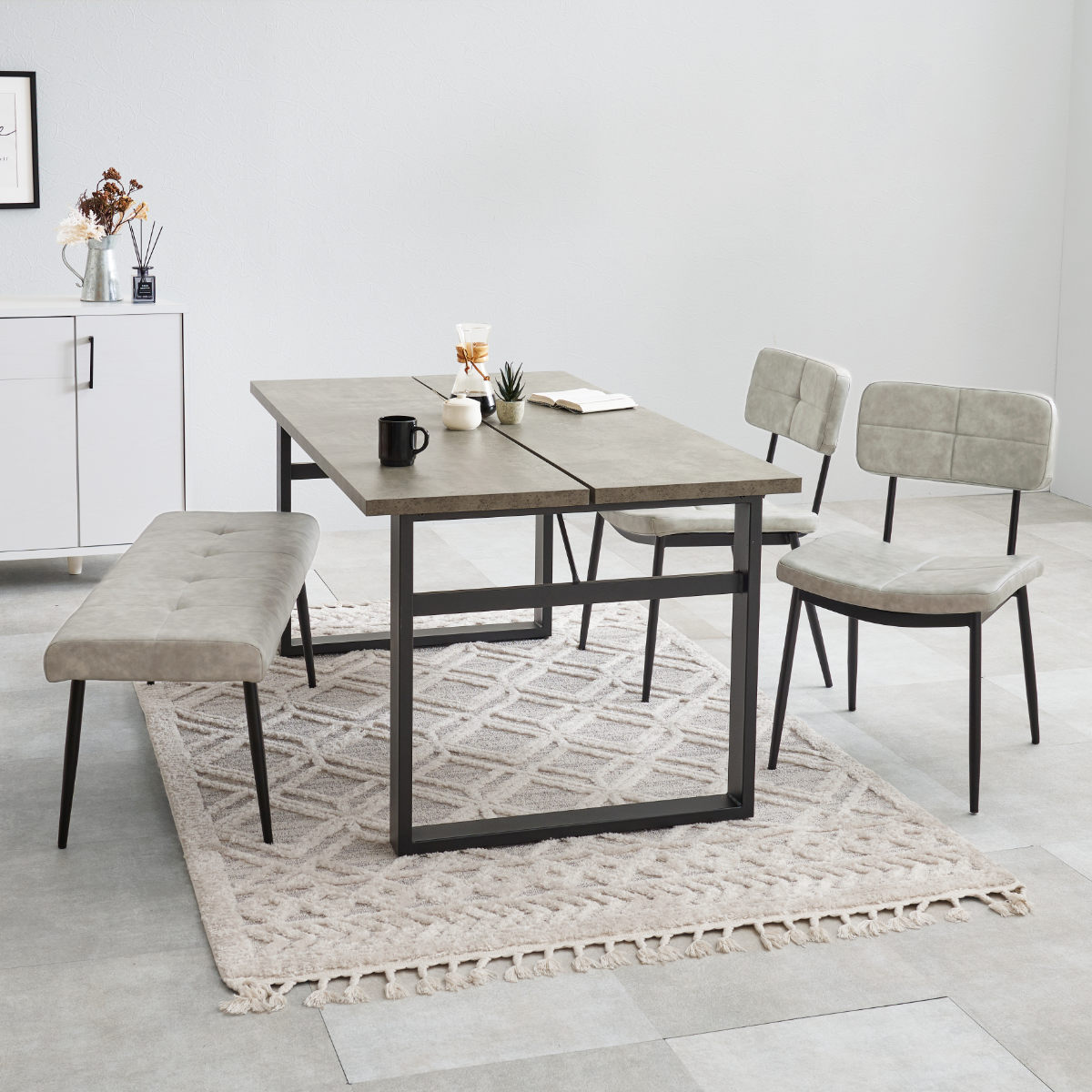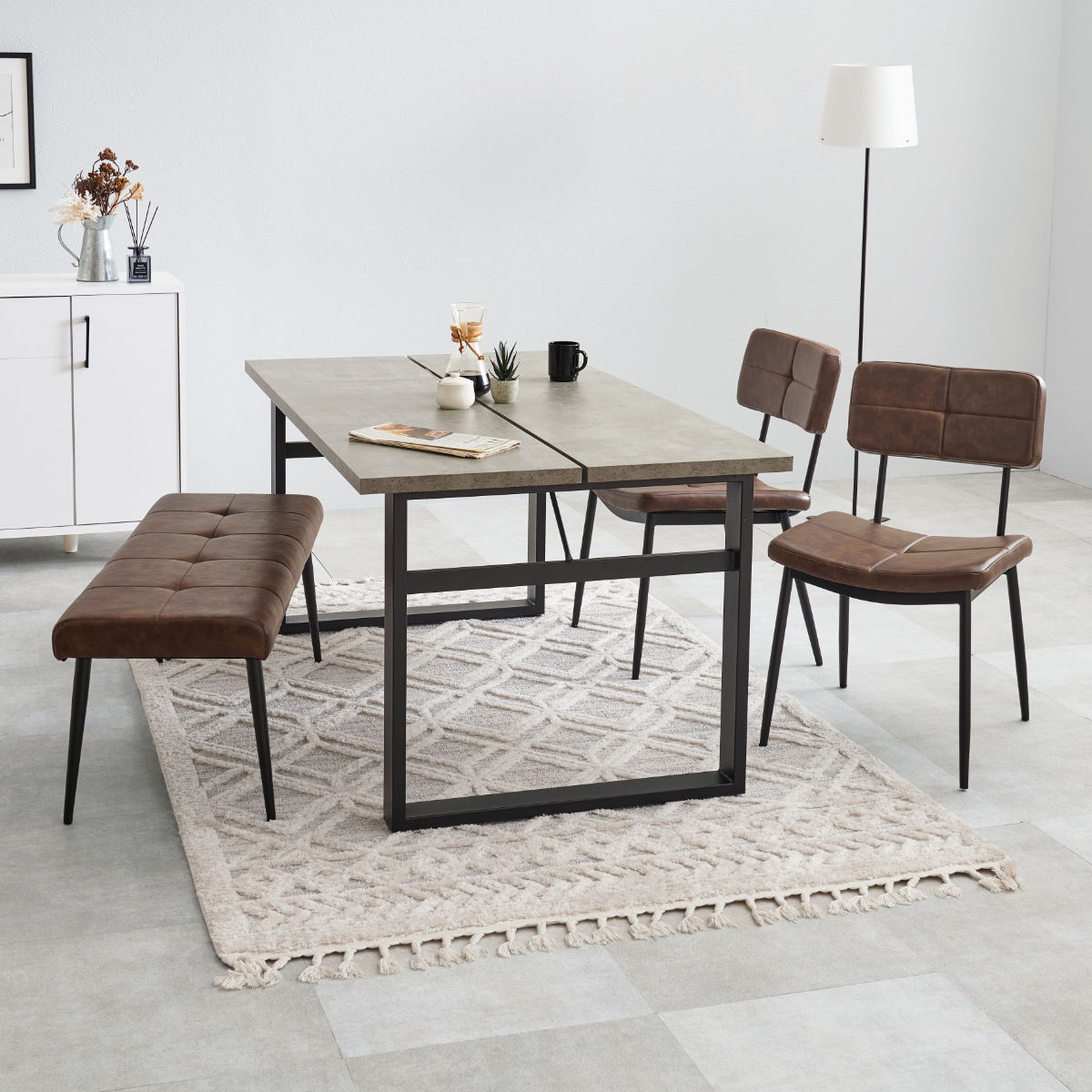 コンクリート調ダイニングテーブル、ヴィンテージ風チェア、ベンチの4点セットです。無骨な質感のテーブルと本革のような風合いの椅子がマッチし、洗練された雰囲気を演出します。