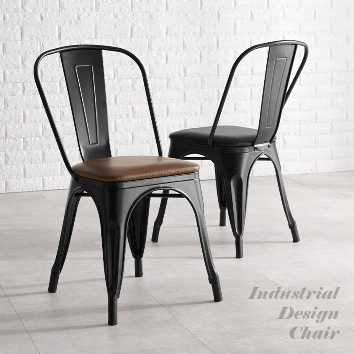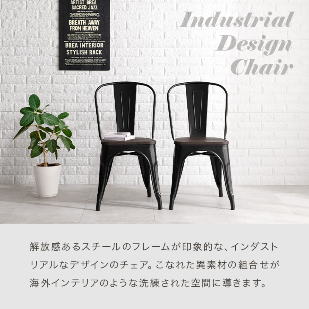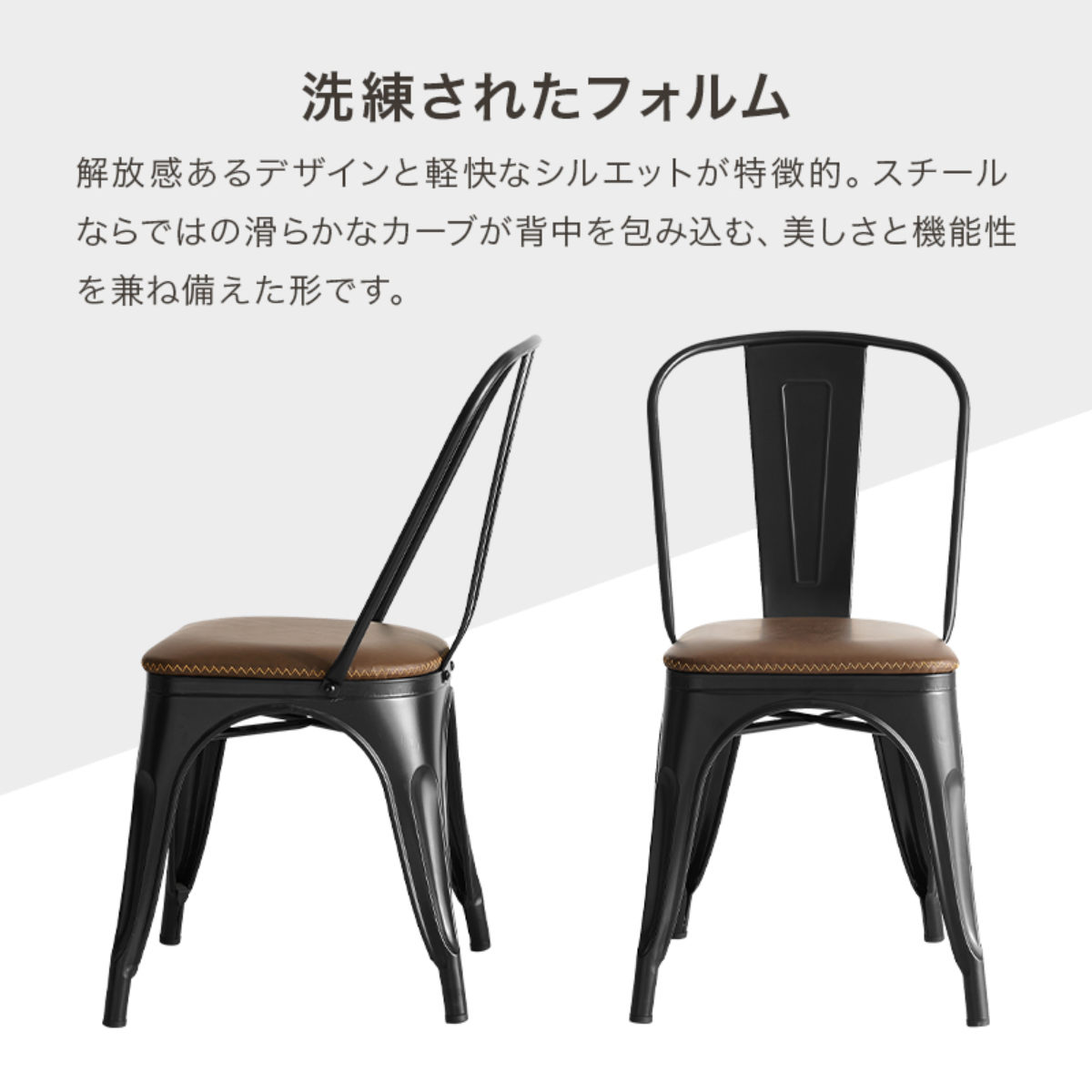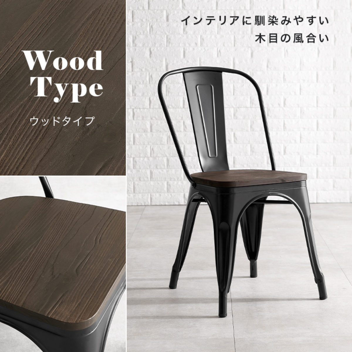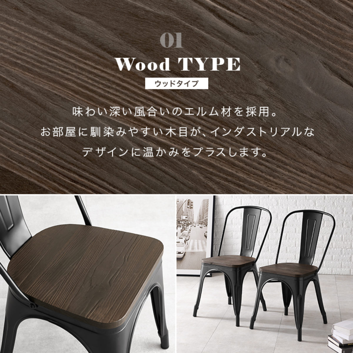 開放感のあるスチールフレームに、異素材の座面を組み合わせたインダストリアルなチェアです。レザー調の合成皮革はスタイリッシュな印象に、天然木(エルム材)は温もりのある雰囲気に仕上げます。インテリアのテイストやお好みに合わせてお選びいただけます。