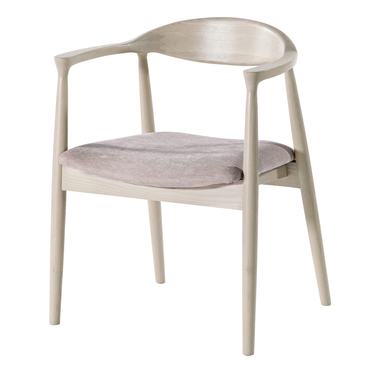 背面とアームの曲線が美しく、丸みを帯びたフォルムが特徴のダイニングチェアです。天然木の温かな質感とファブリックのディテールが相まって、優しい雰囲気を演出します。