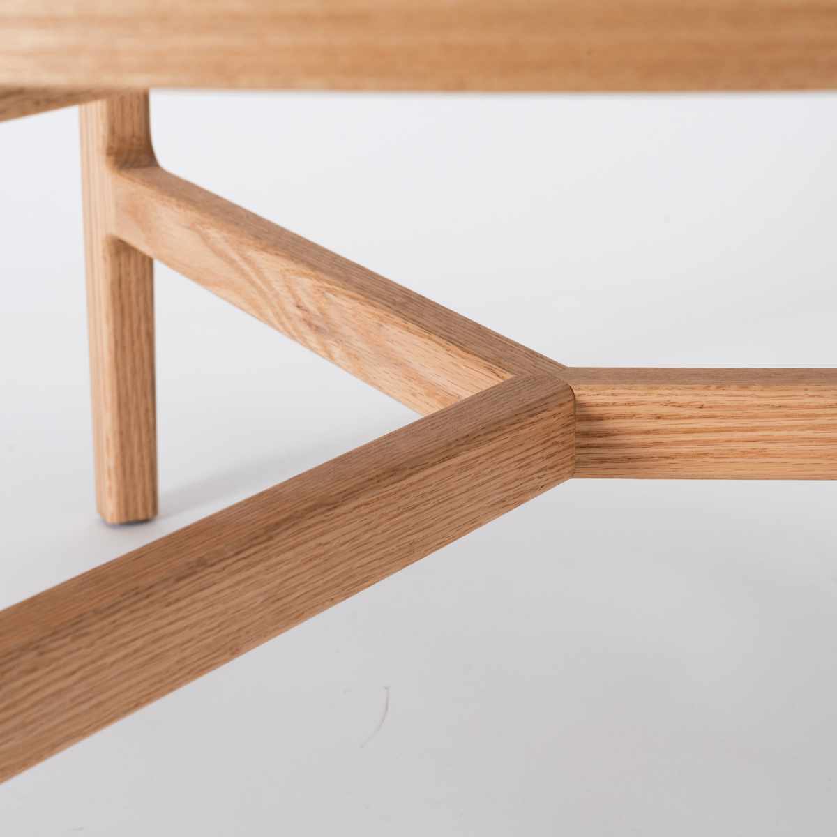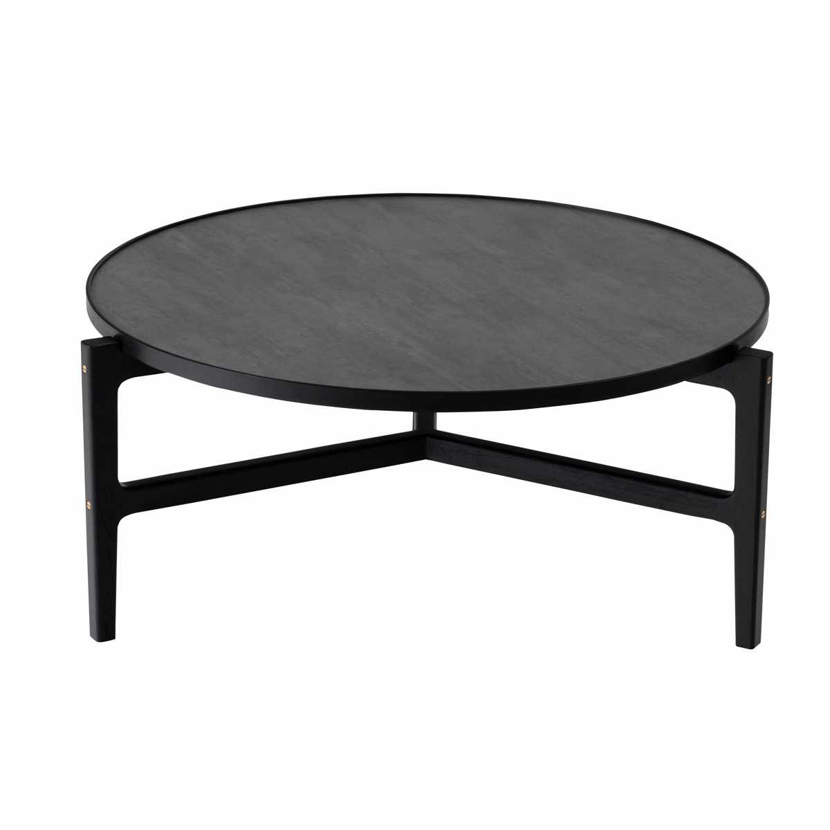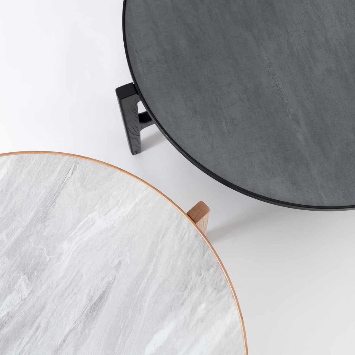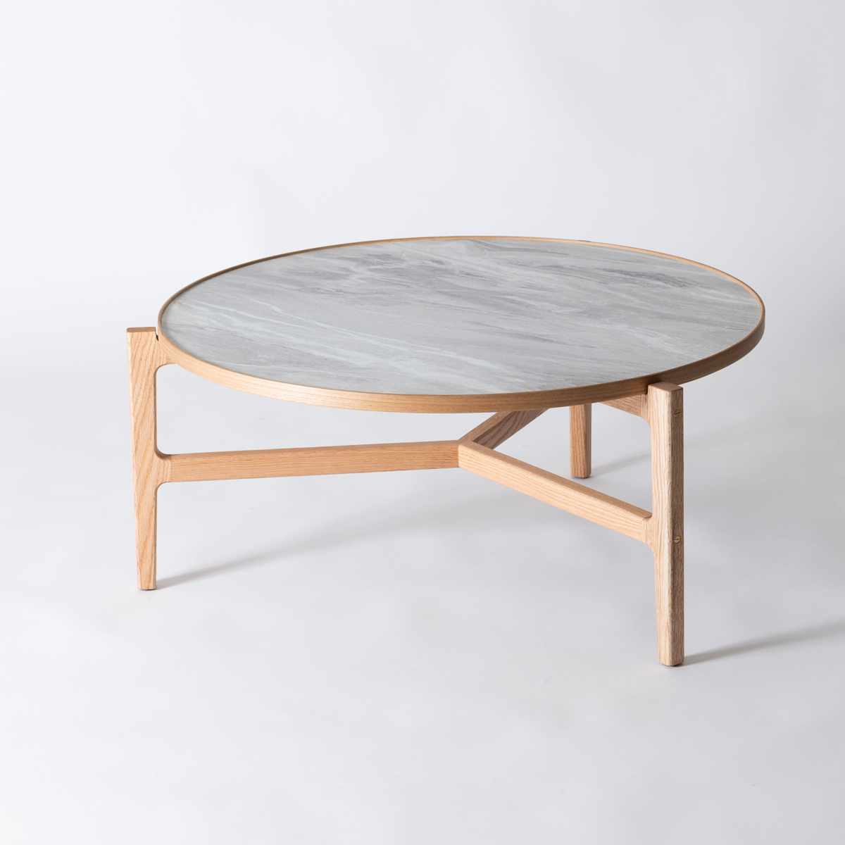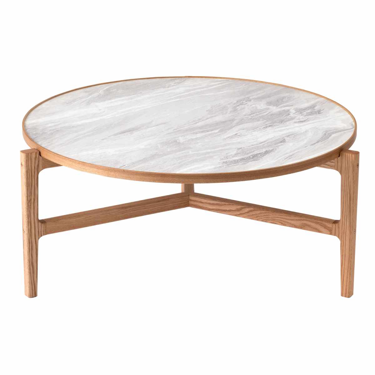 石目調の天板と天然木の組み合わせがナチュラルな雰囲気を与えてくれるローテーブルです。オーク材のフレームで囲われた正円形の天板と、遊び心のある3本脚がどの角度から見ても美しいデザインです。