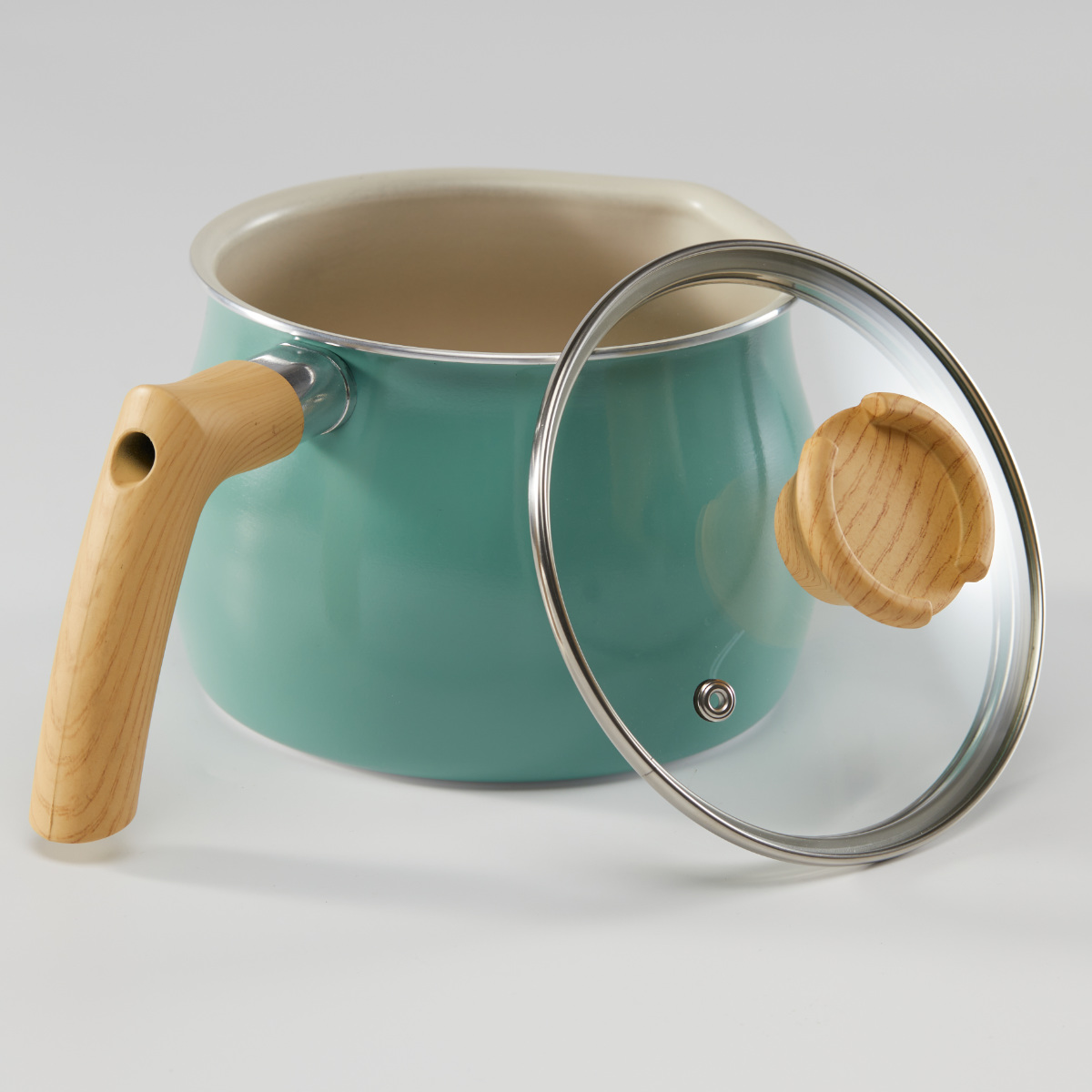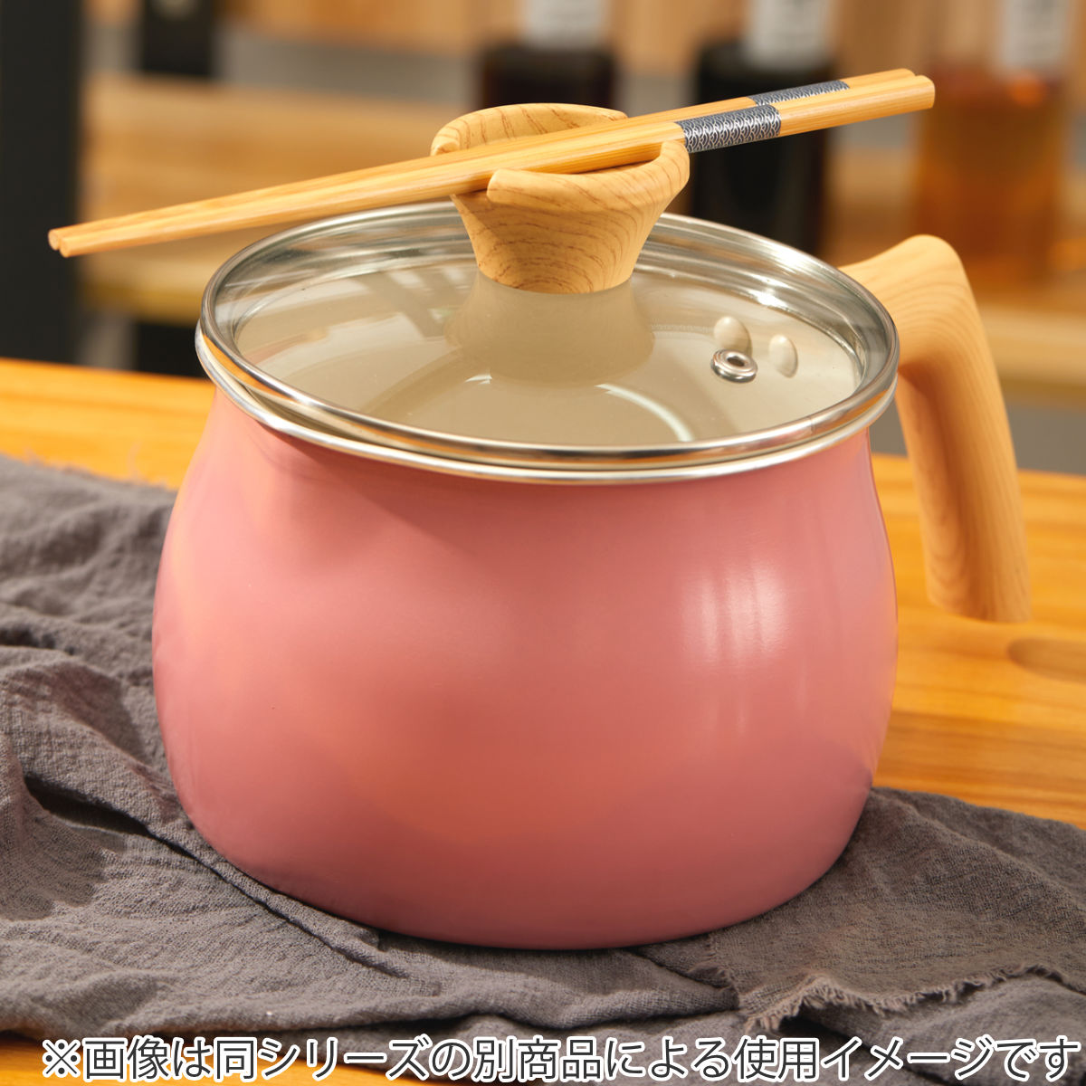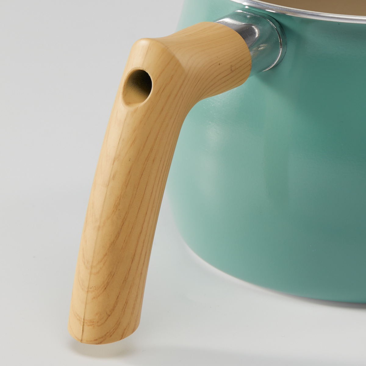 注ぎ口付きなのでケトルとしても便利にお使いいただけます。下向きについている持ち手は、木目調のシリコン製なので握りやすく、コンパクトで収納も場所を取りません。