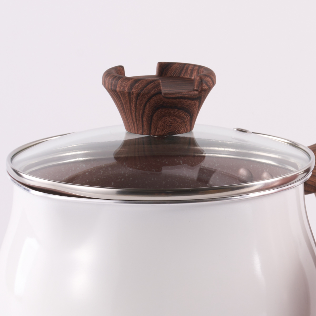| 材質 | 本体:アルミニウム合金 内面:ふっ素樹脂加工 外面:焼付塗装 底面:ステンレス鋼(クロム18%) ハンドル:フェノール樹脂(シリコン塗装) ガラス蓋:強化ガラス |