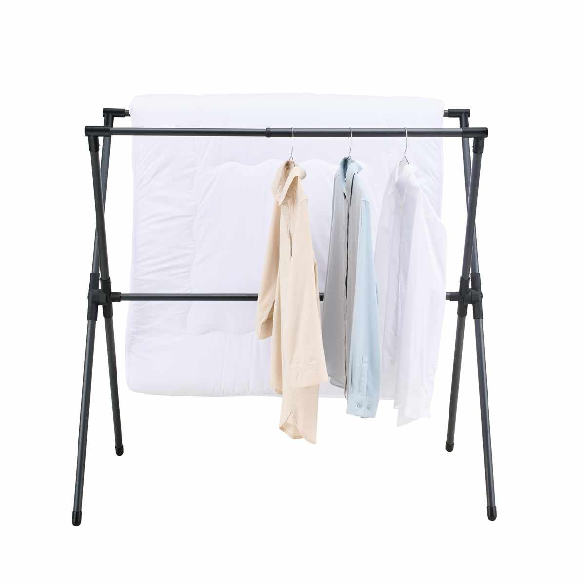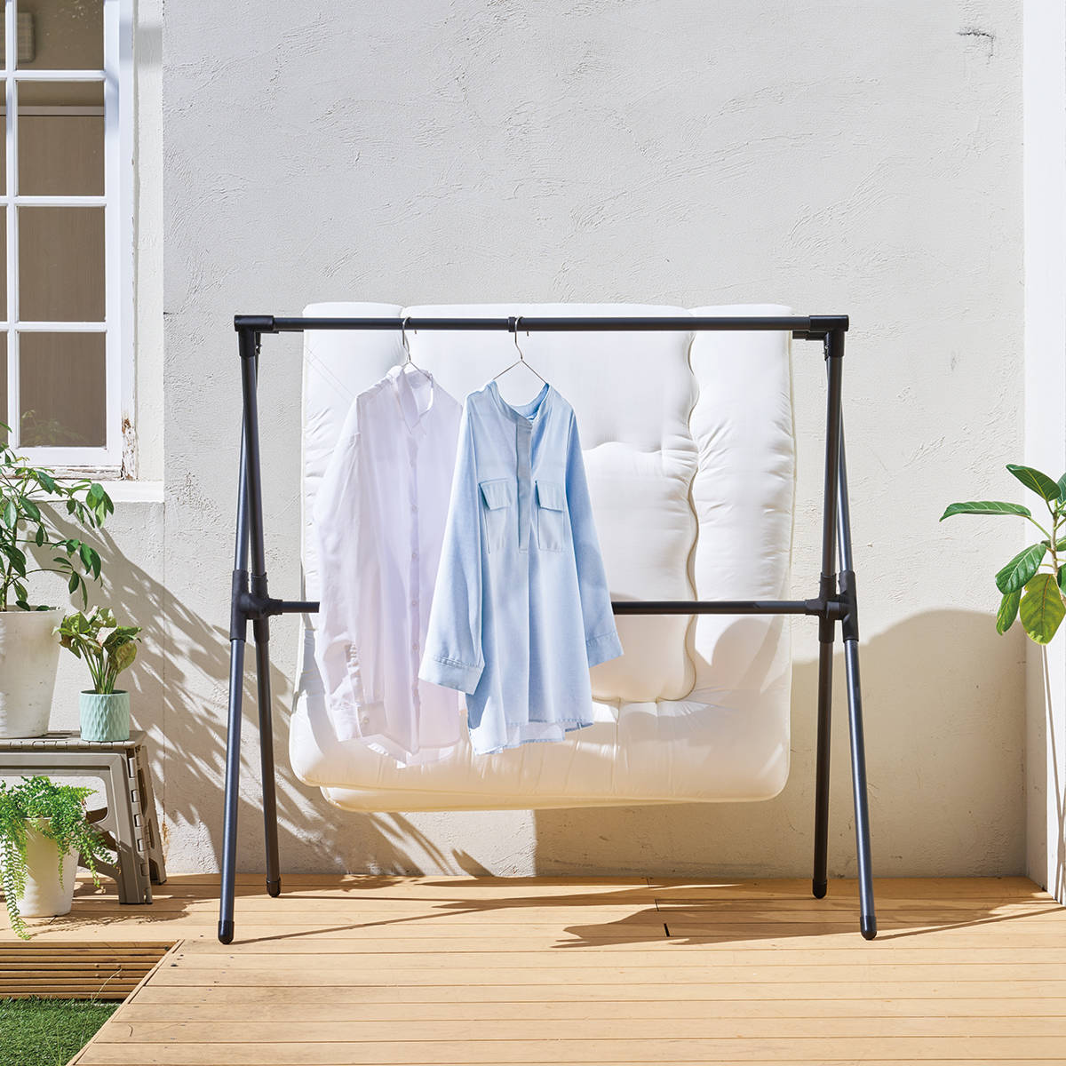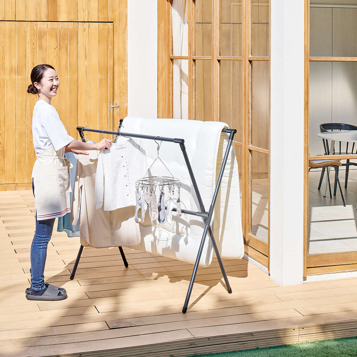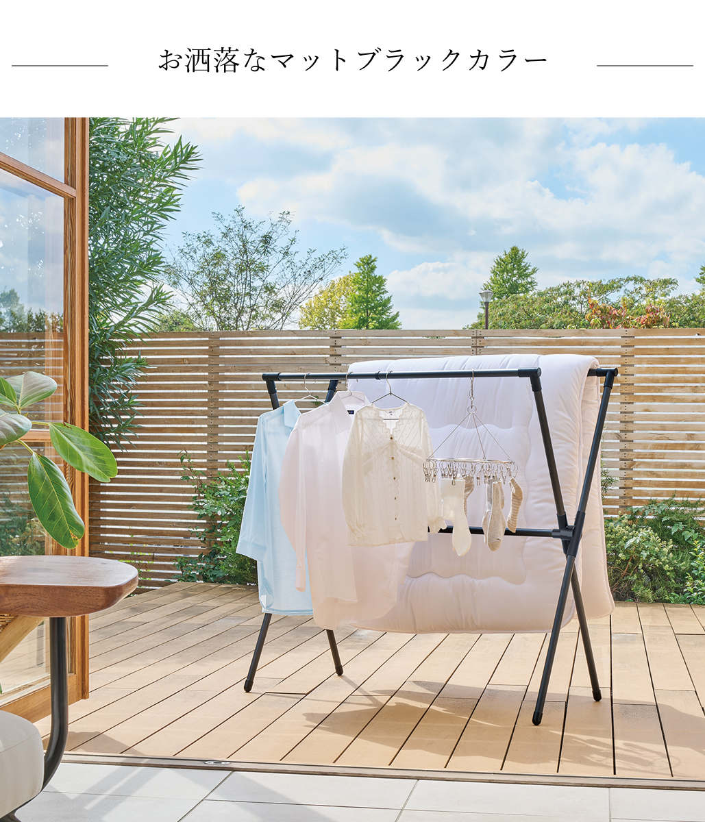 マットブラックの洗練されたデザインが空間に映える、X型の物干しです。指紋やホコリが目立ちにくいため使いやすく、見た目と実用性を兼ね備えた1台です。