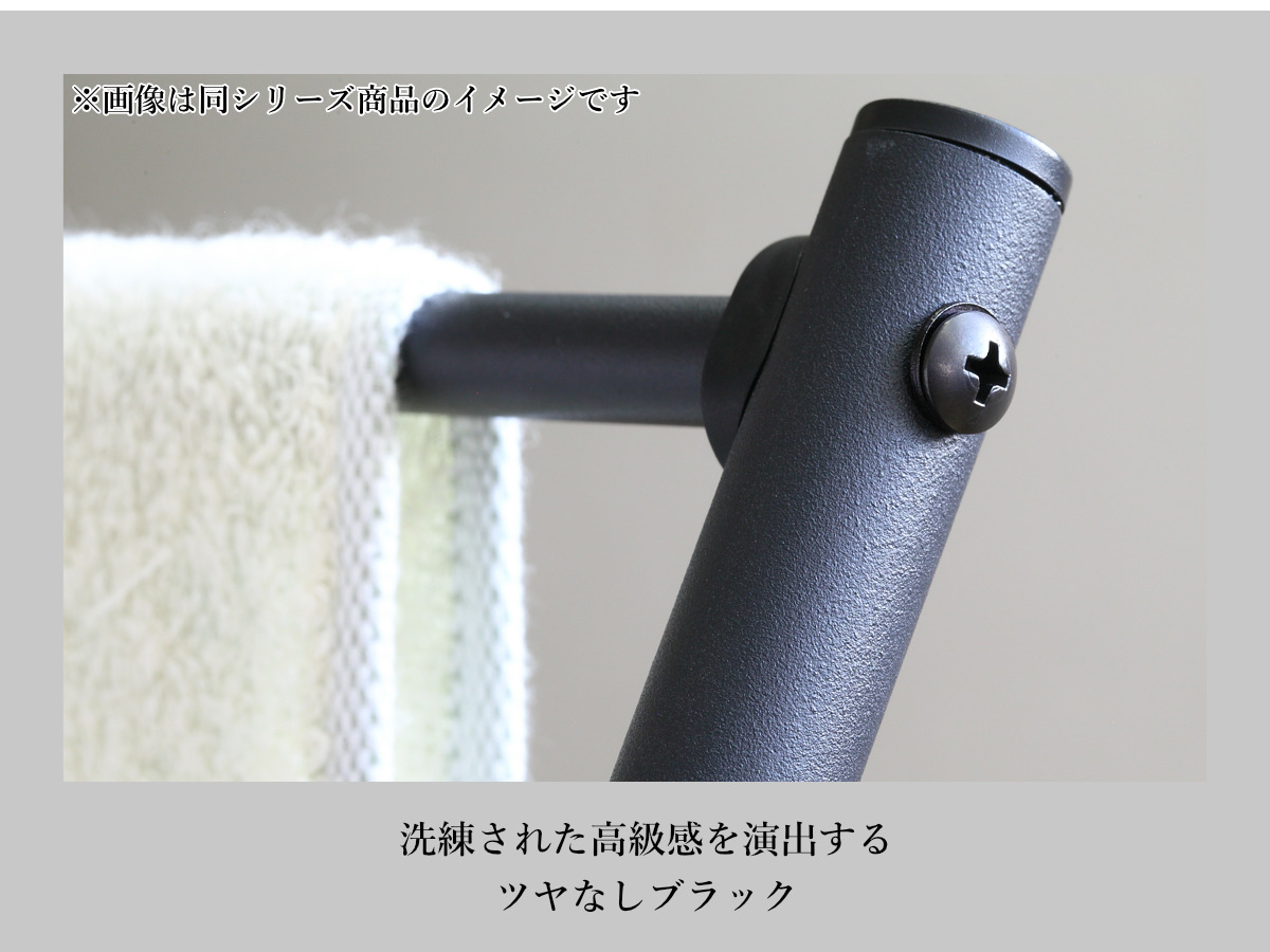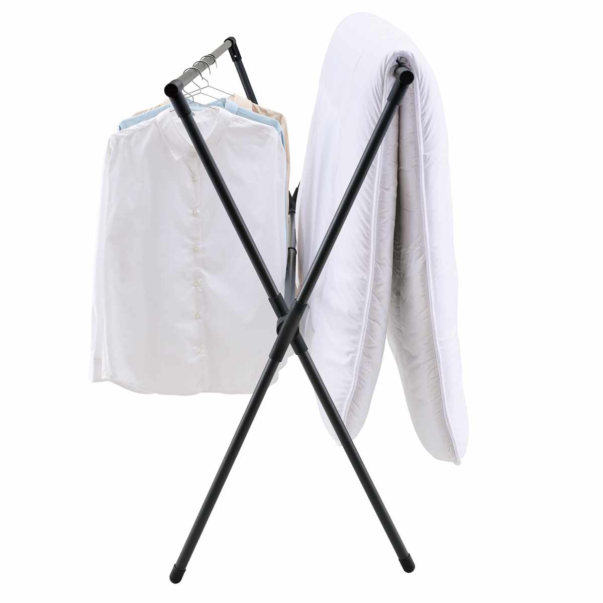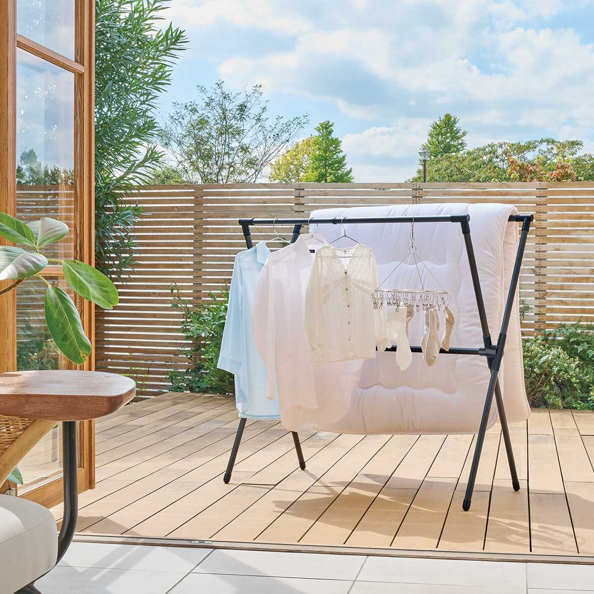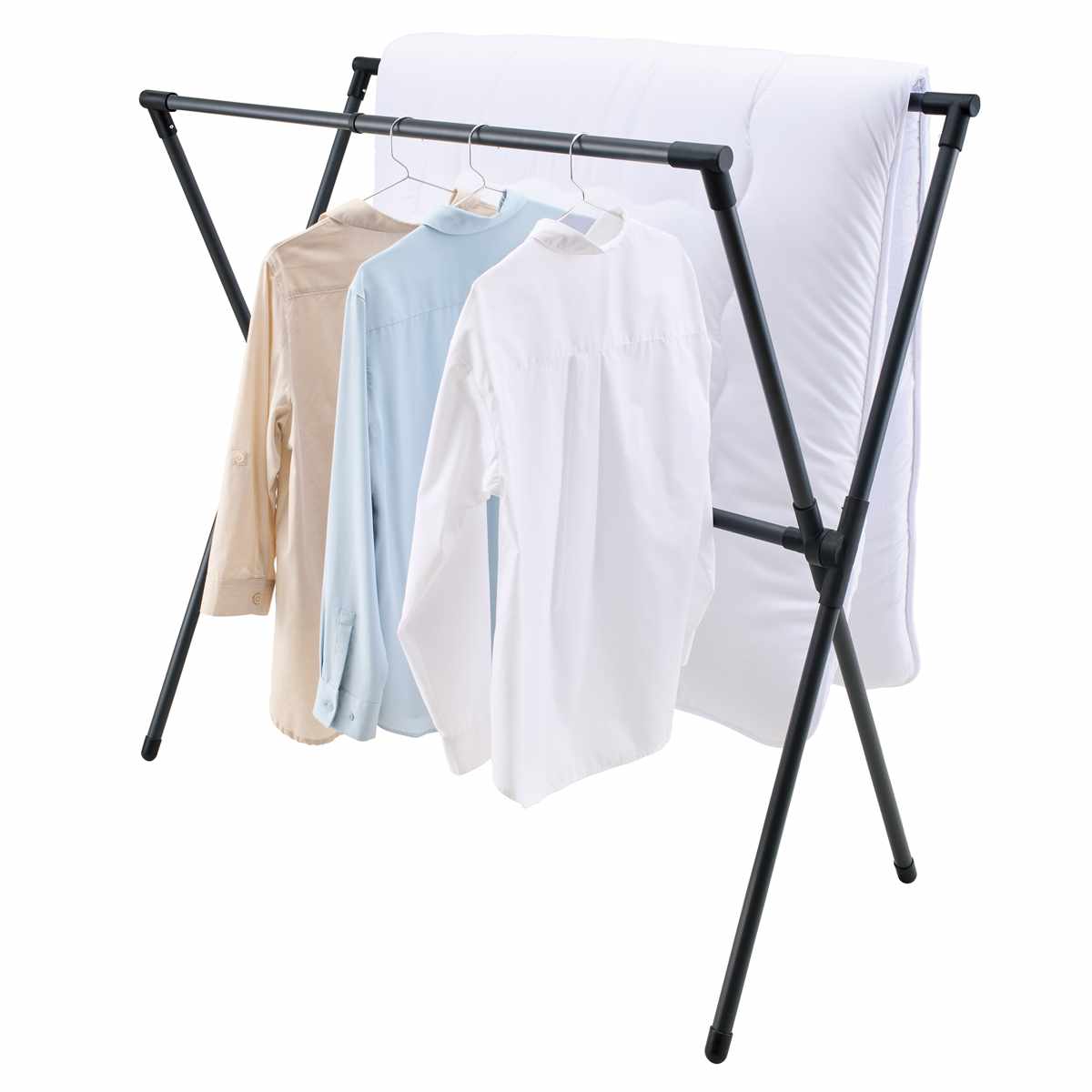 マットブラックの洗練されたデザインが空間に映える、X型の物干しです。指紋やホコリが目立ちにくいため使いやすく、見た目と実用性を兼ね備えた1台です。