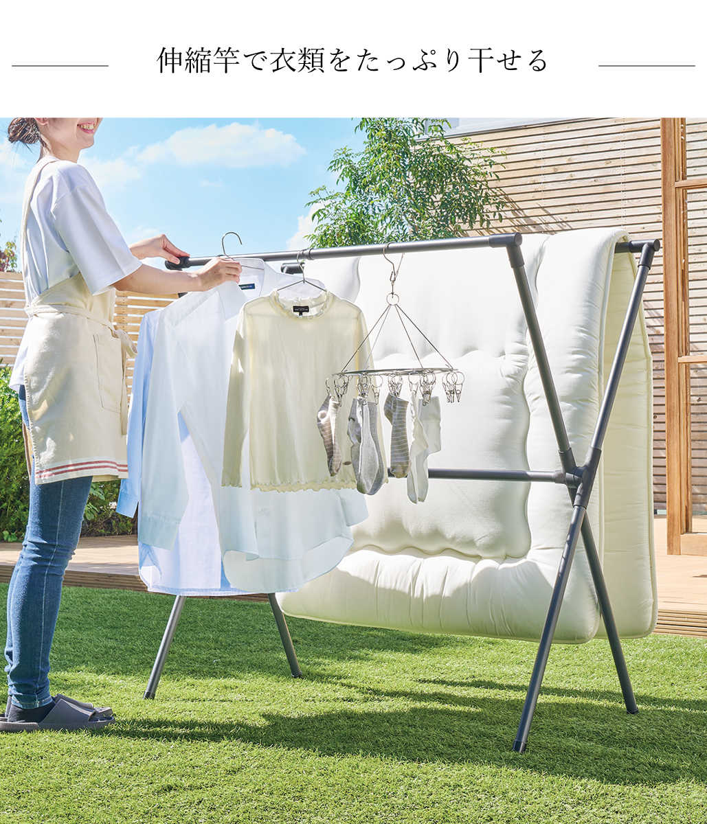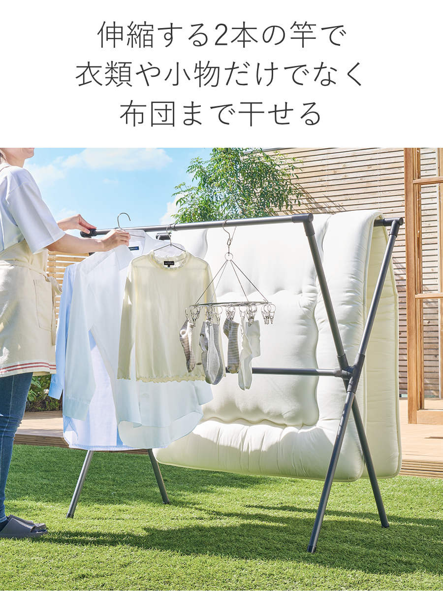 伸縮する2本の竿で、衣類から小物まで様々な物を干すことができます。幅は87~138cmまで伸縮ができ、洗濯物の量に合わせて調節できます。