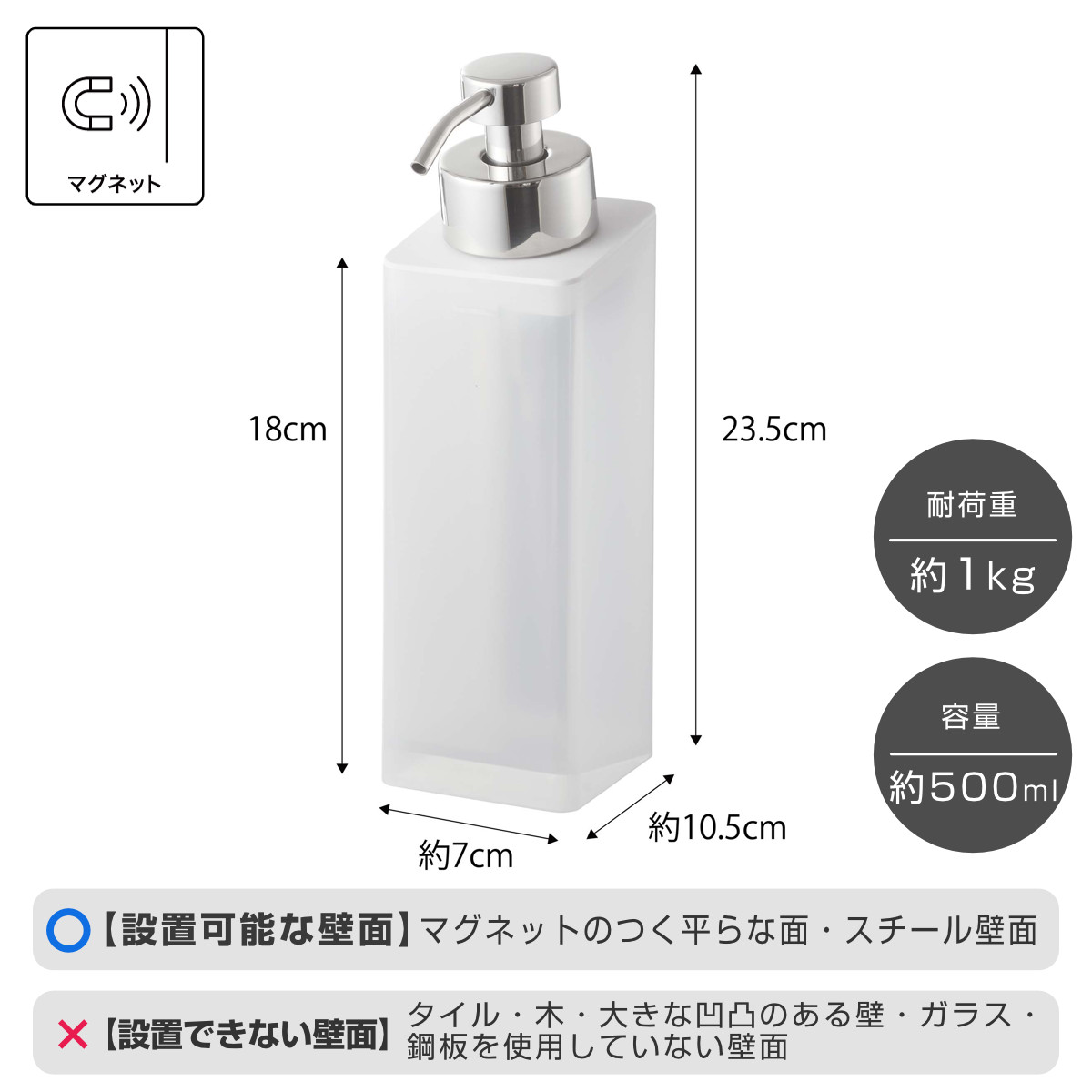 | 備考 | 泡タイプの詰め替え用パック:400ml以内 容器サイズ:約W7×D7×H18cm 【取り付け可能な壁面】 マグネットが付く平らな面・スチール壁面 |