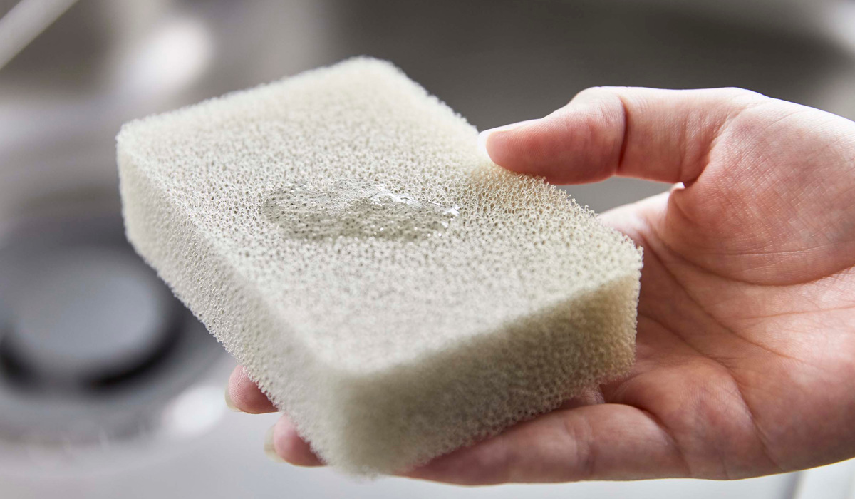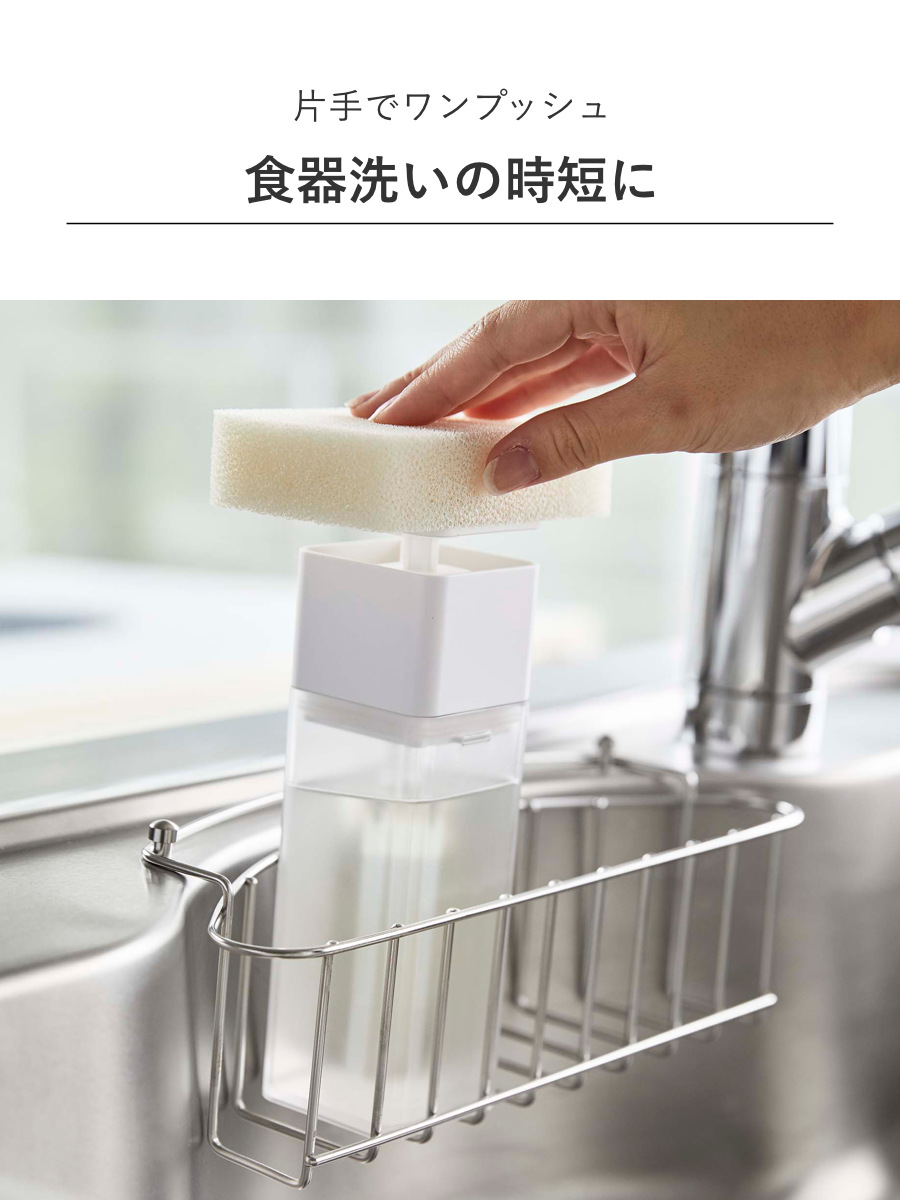 上部のポンプをスポンジ越しに押すことで、スポンジに直接洗剤が付きます。一回で約1.6ccの適量が出るようになっています。途中で洗剤を足したくなった時も、食器洗いの手を止めることなく片手だけで洗剤追加ができるので食器洗いの時短につながります。