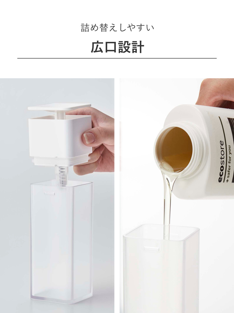 本体上部が大きく開き、洗剤が付いたポンプに手を触れずにフタを開けることができます。詰め替えを注ぎやすい広口で、約250ml入ります。