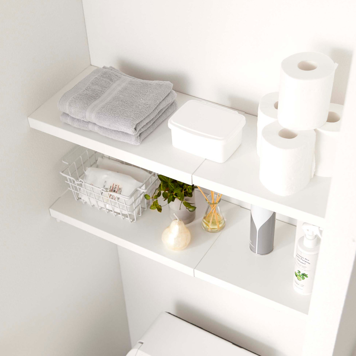 お手持ちのつっぱり棒やつっぱり棚の幅に合わせて上に置くだけで、簡単に棚を作ることができます。