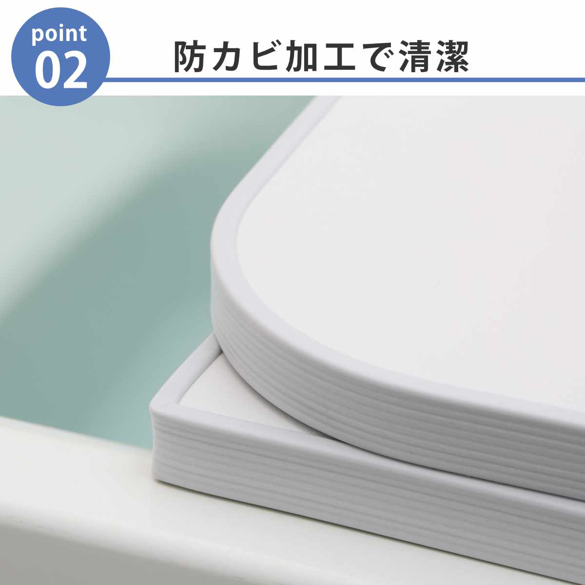 カビの生えやすい「エッジ部分」は防カビ加工が施されています。湿気の多い浴室でもカビが発生しにくく、清潔な状態を長く保てます。