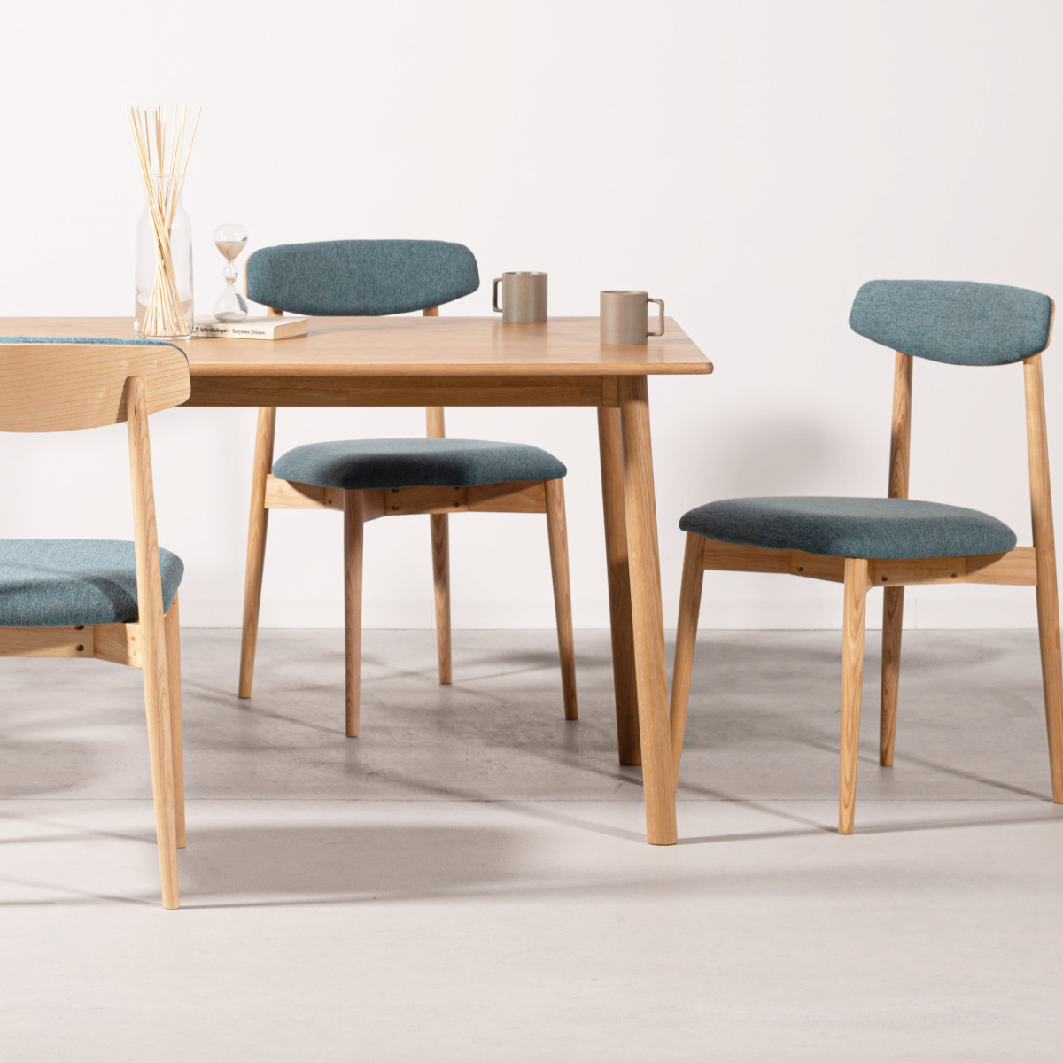 薄めの座面は、身体が沈み込みにくく、食事中に良い姿勢を保ちやすいです。