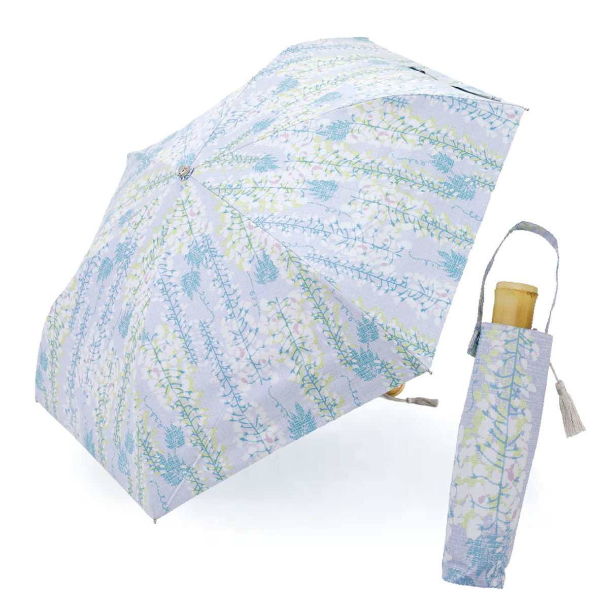 | 藤 布の織りのような模様と、上品で儚い印象のある藤の花を合わせてパターンにしました。 | ミモザ 広げた傘全体が大きなリースのように見えるデザインにしました。 |
