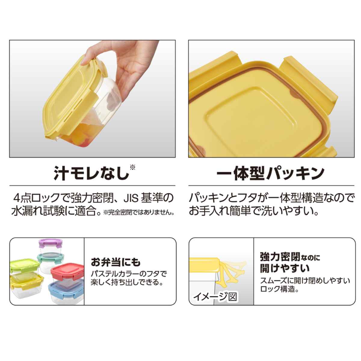 4点ロック構造による強力な密閉性で、汁気の多い煮物や水分を含むフルーツも安心して保存できます。JIS規格の水漏れ試験にも適合しており、持ち運びにも心強い設計です。