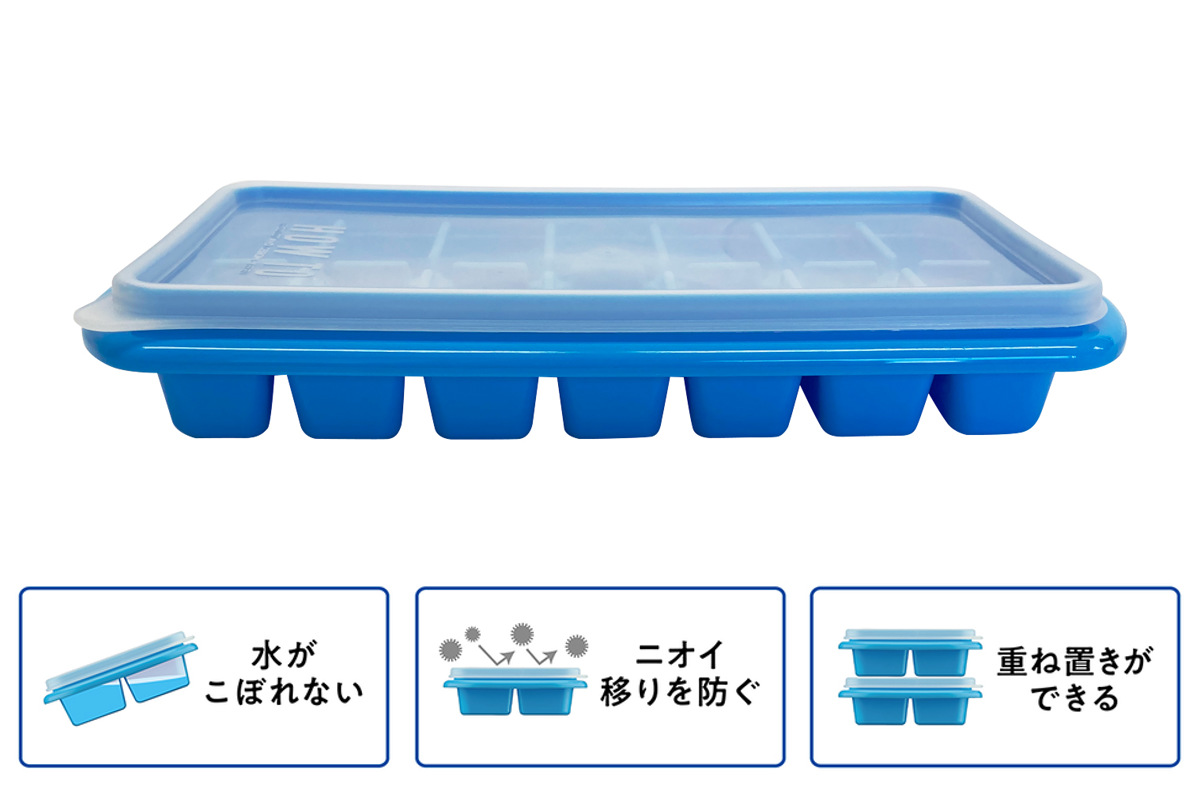 持ち運びや冷凍庫の開閉時に、水がこぼれない密閉性の高いフタ付きです。冷凍庫内で重ねて収納ができ、スペースを有効活用できます。