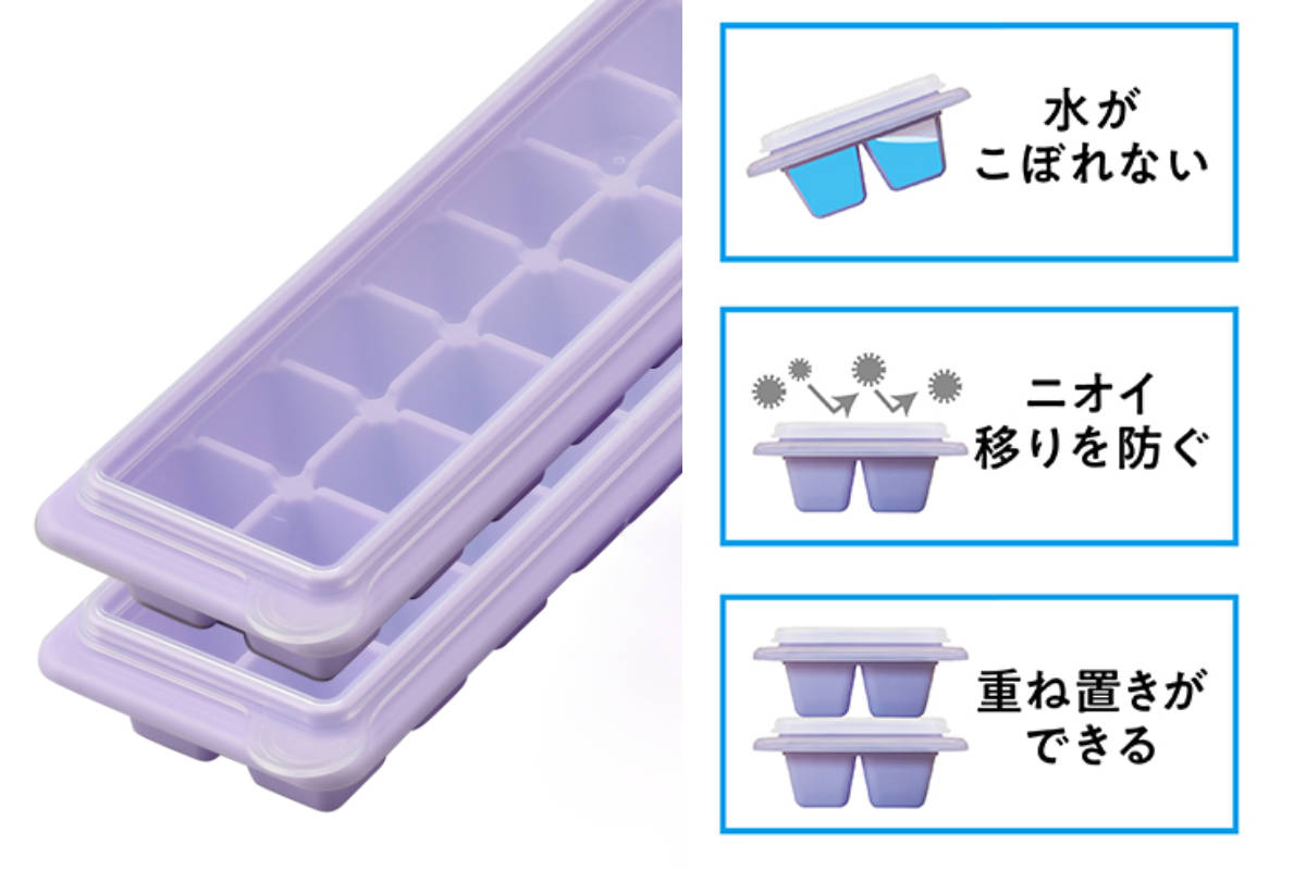 フタ付きだから水がこぼれず、冷凍庫内のニオイ移りも防止。さらに重ねて収納できるので、さらに省スペースに収納できます。