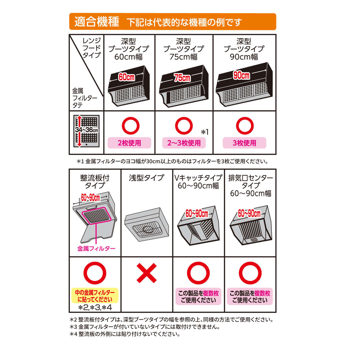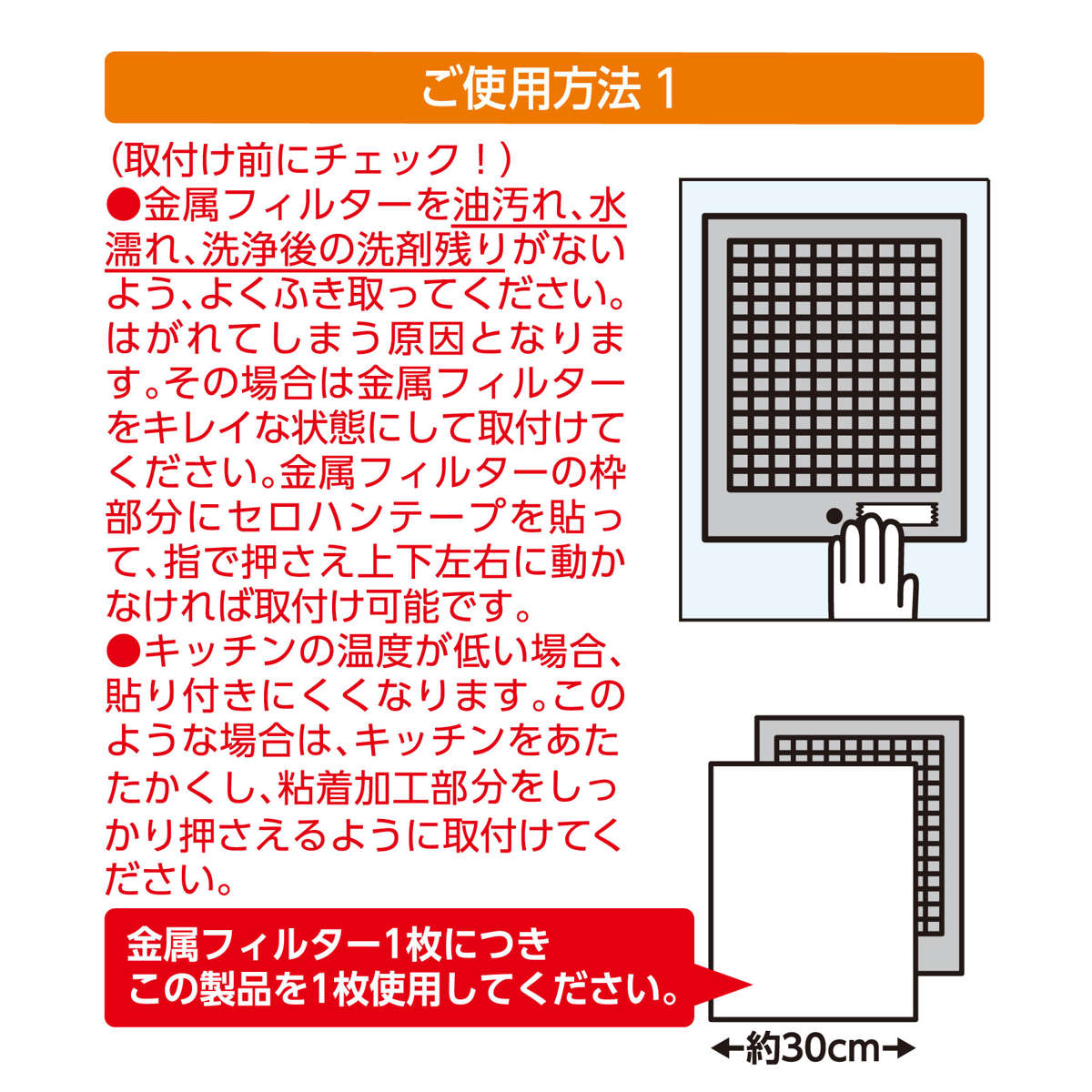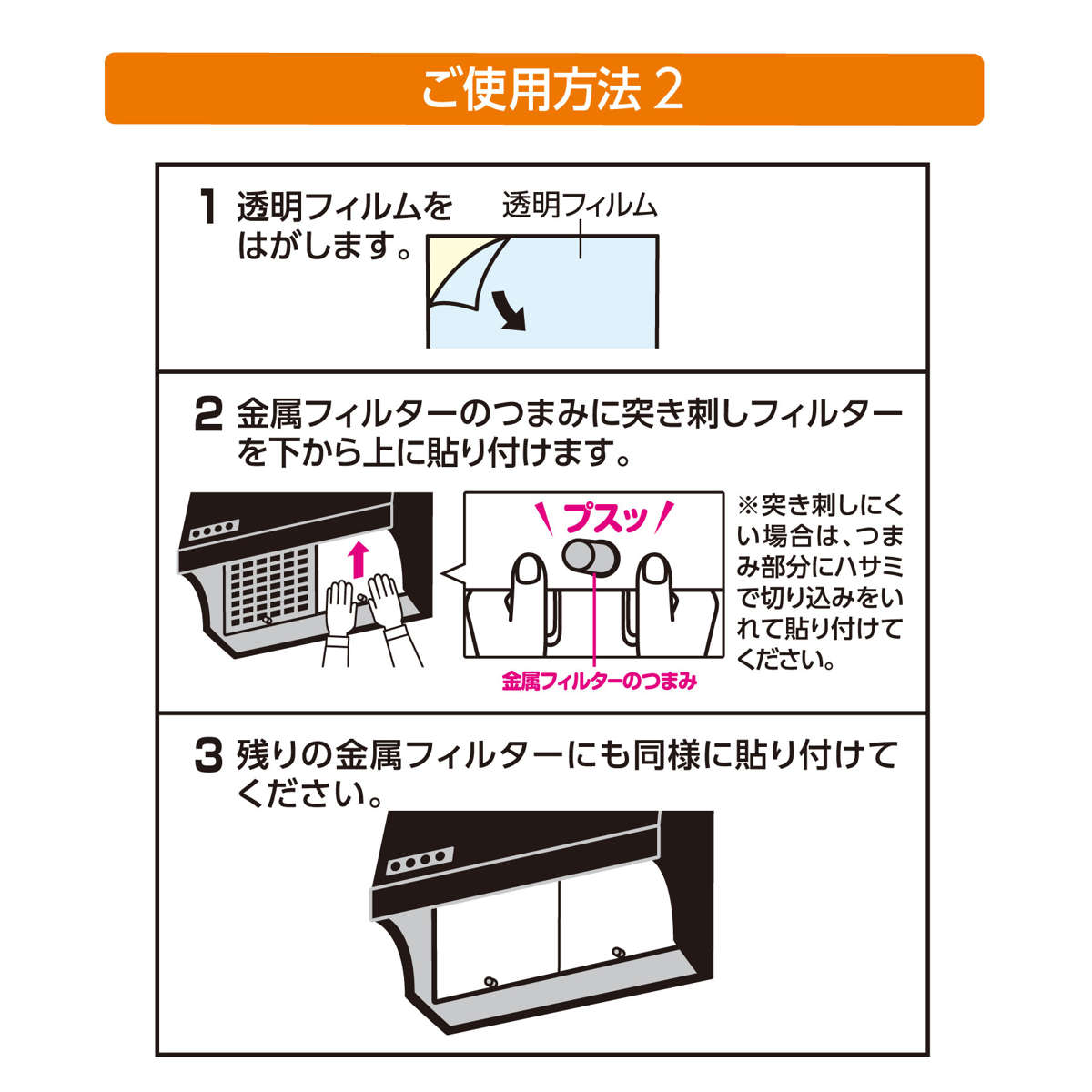 粘着タイプなので、シール感覚で金属フィルターに貼るだけで簡単に取り付けできます。