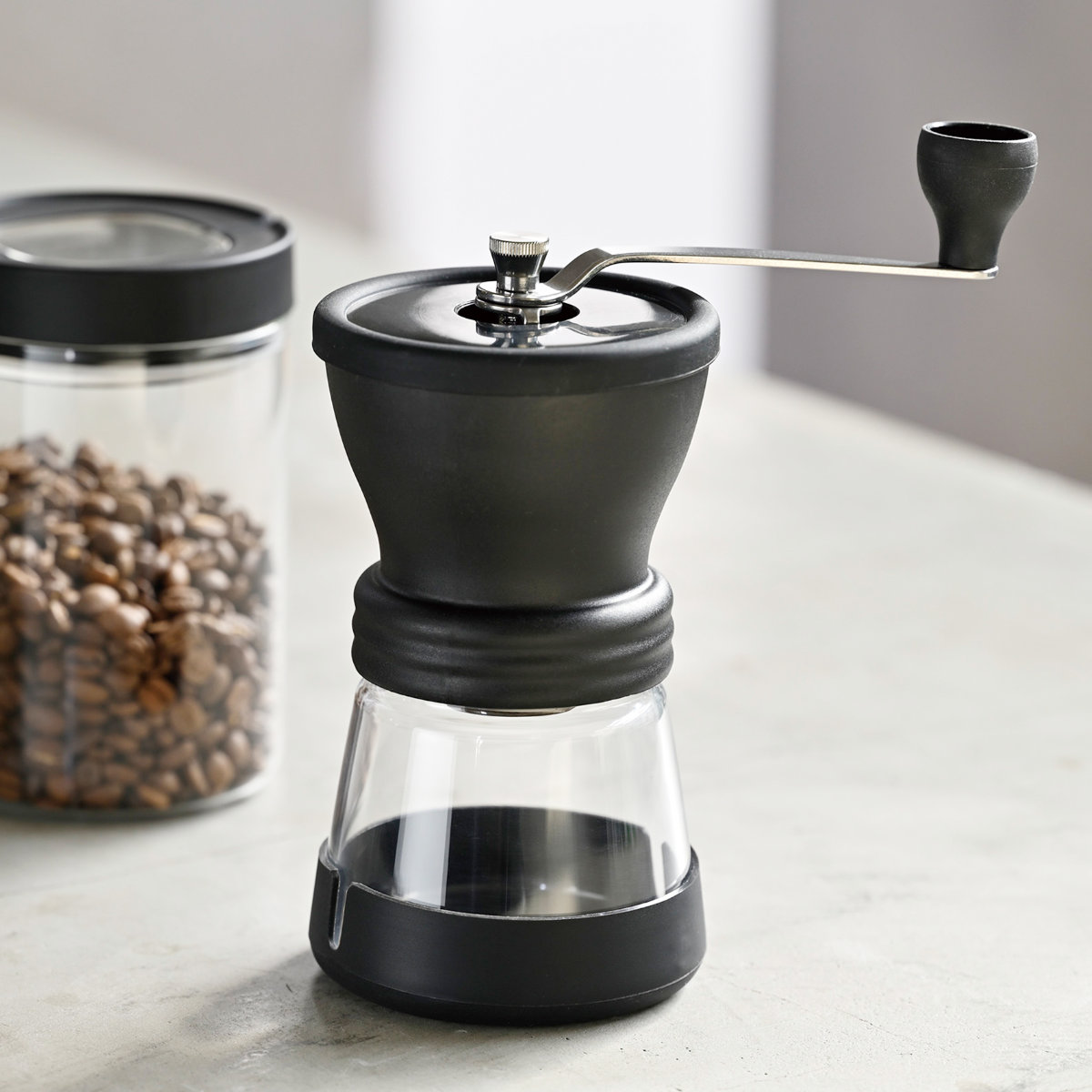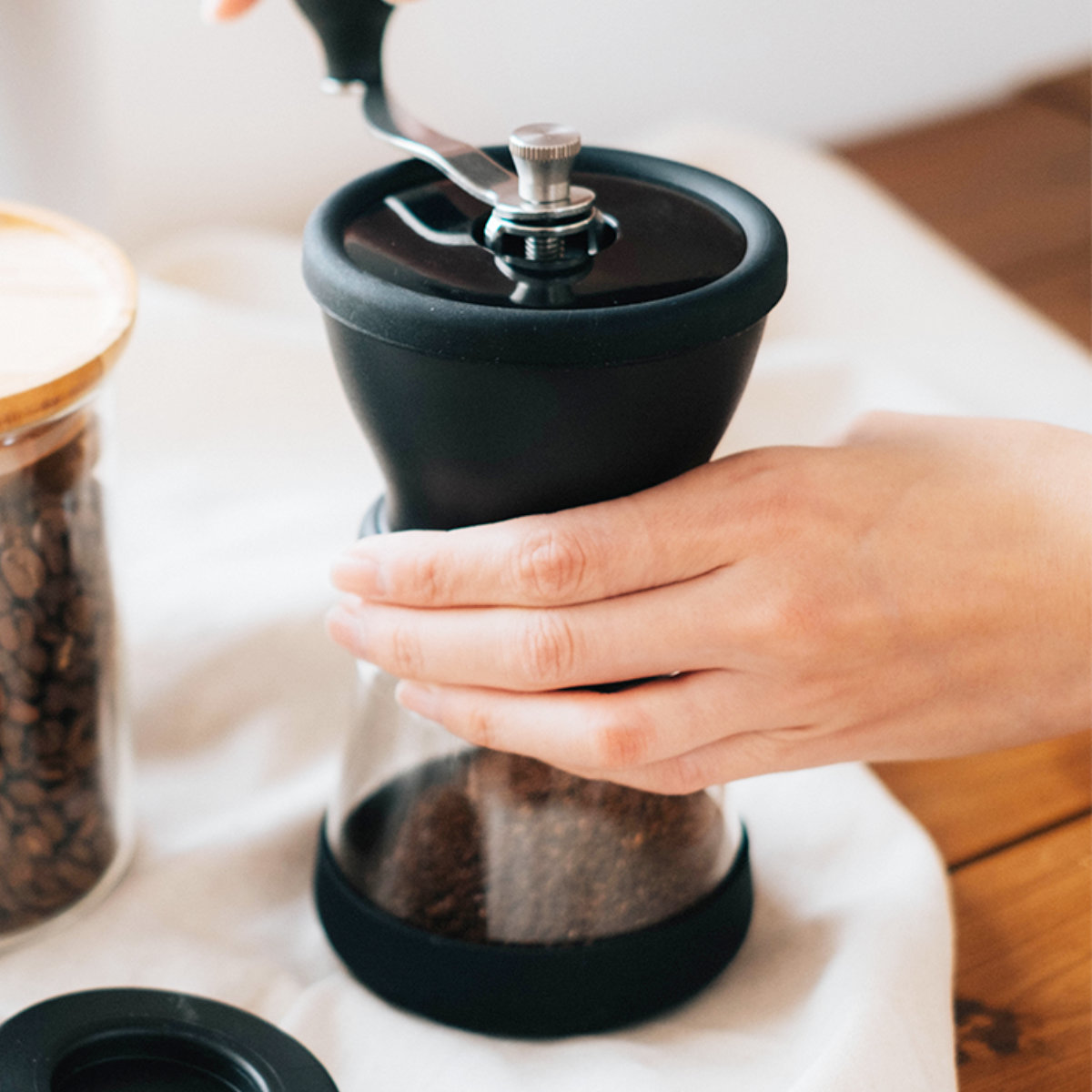 コーヒー豆を挽き終わったら下の粉受けが密封出るキャニスターになります。フタをしてコーヒー粉の保存容器に。ミル本体はフタの上に重ねられるので、省スペースで収納できます。