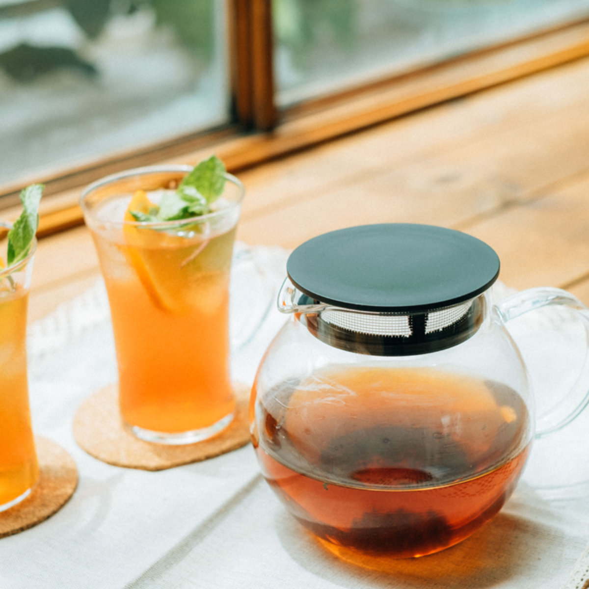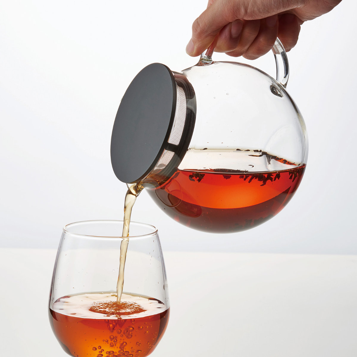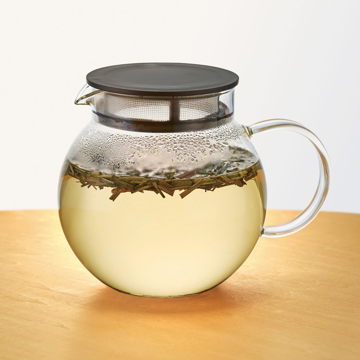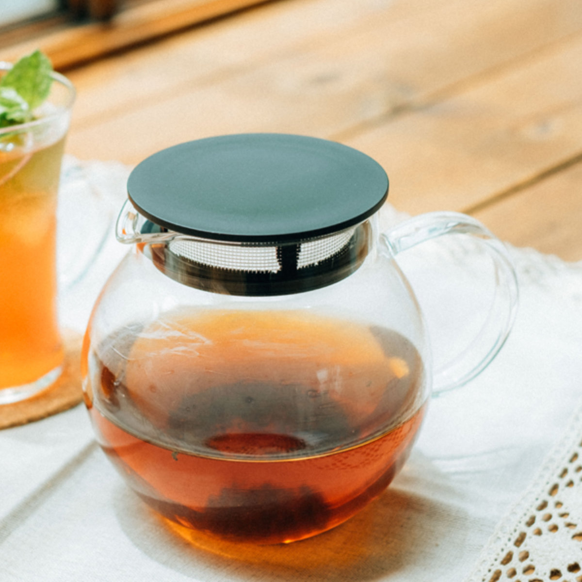 ティーポット本体がガラス製なので、茶葉が開く様子やドリンクの色をじっくりと眺めて愉しめます。日本茶、紅茶など、様々なドリンクに合わせやすいデザインです。