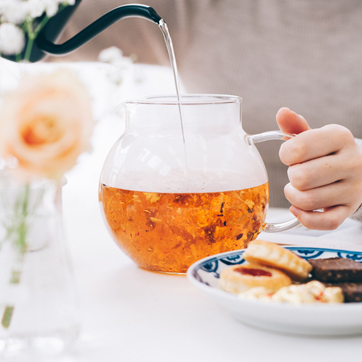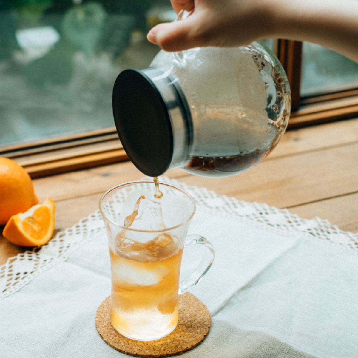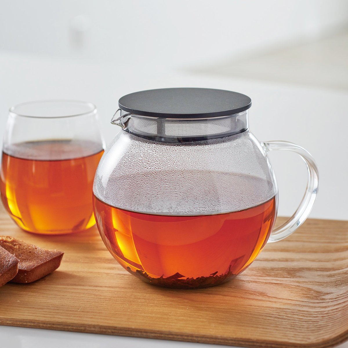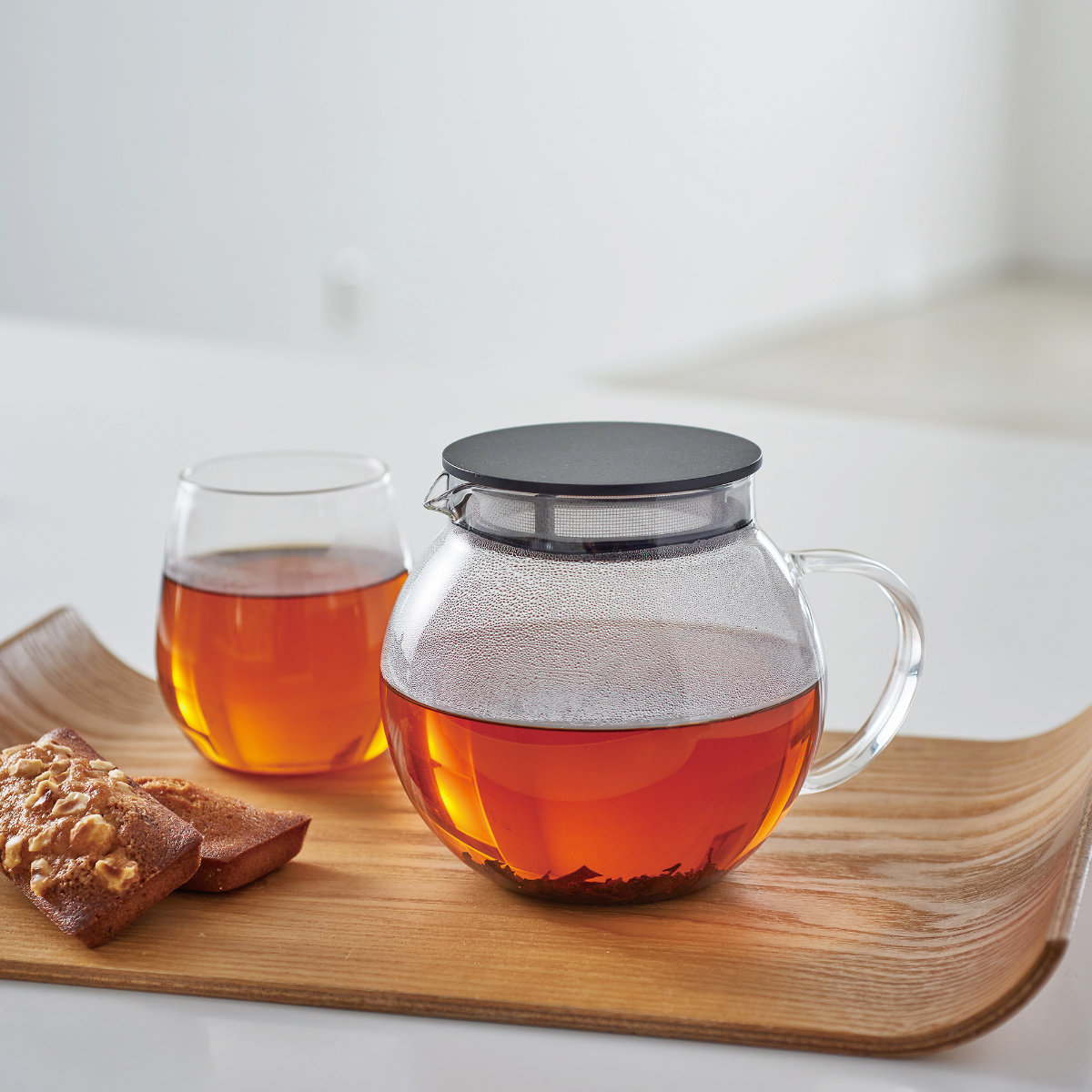 ティーポット本体がガラス製なので、茶葉が開く様子やドリンクの色をじっくりと眺めて愉しめます。日本茶、紅茶など、様々なドリンクに合わせやすいデザインです。