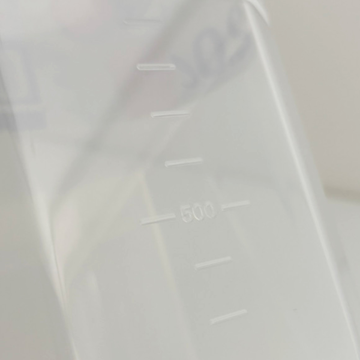 本体には100mlごとの目盛り付いています。水分摂取量の確認や、調理時の計量にも便利です。