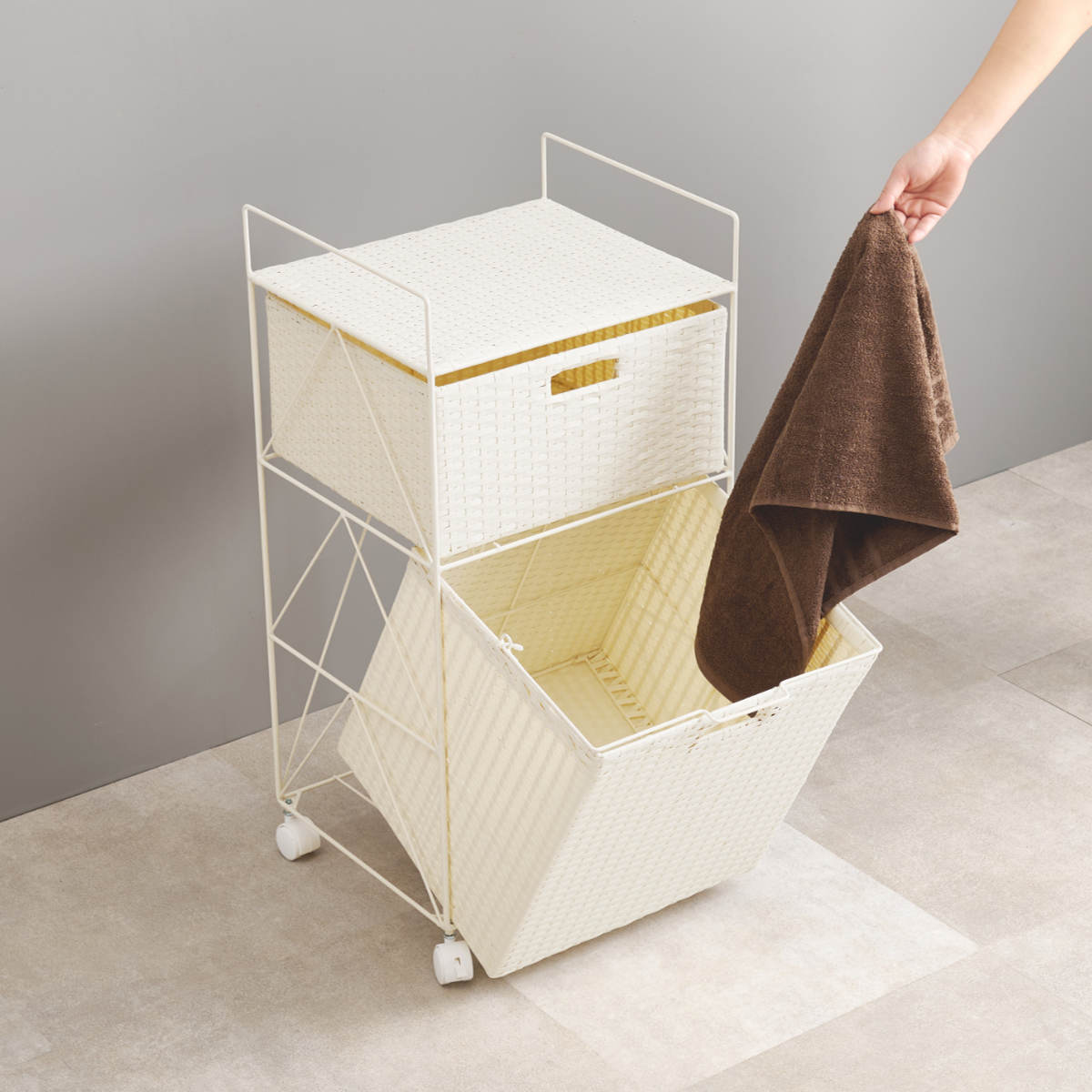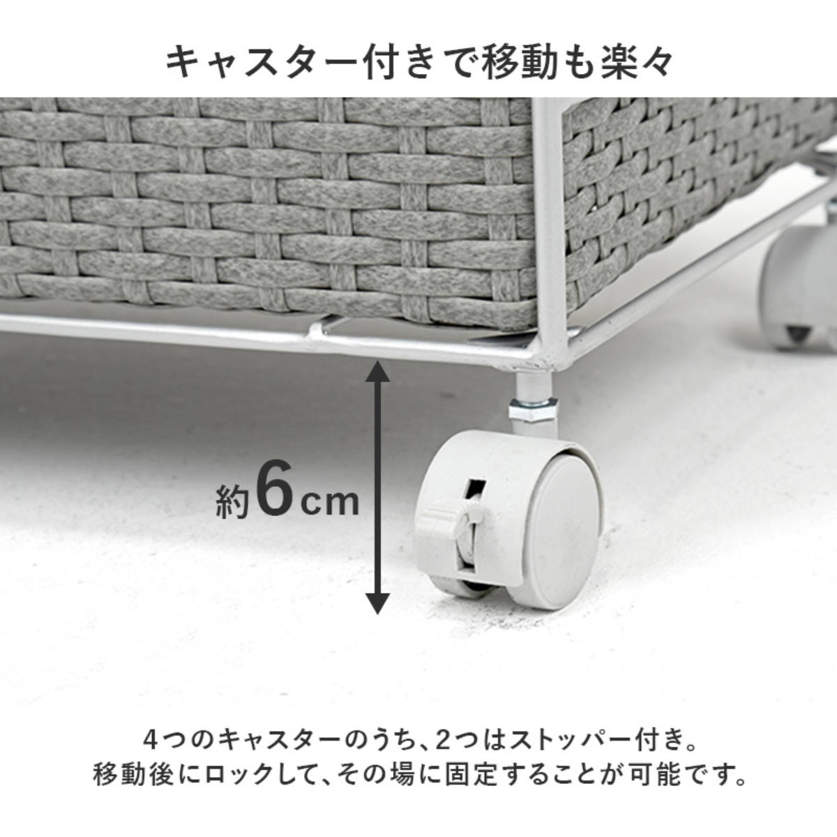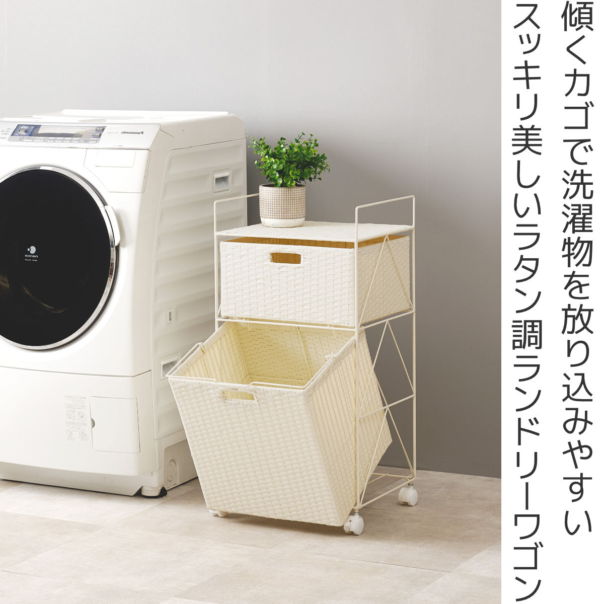 傾くカゴで洗濯物を放り込みやすいランドリーワゴンです。幅40cmと程よいサイズ感で、洗面所などのちょっとしたスペースを有効にお使いいただけます。生活感が出てしまいやすいランドリールームも、ラタン調のバスケットで美しく爽やかな空間に。