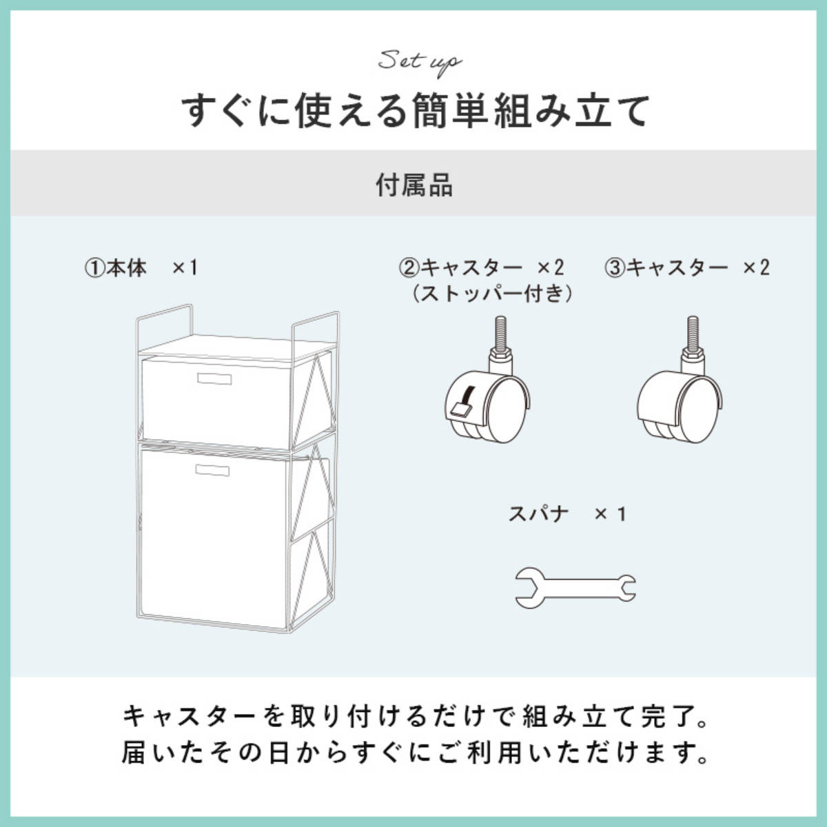 付属の工具でキャスターを取り付けるだけで、すぐにお使いいただけます。ほとんど完成した状態で届くので、組み立て家具や工具を扱うのが苦手な方にもおすすめです。