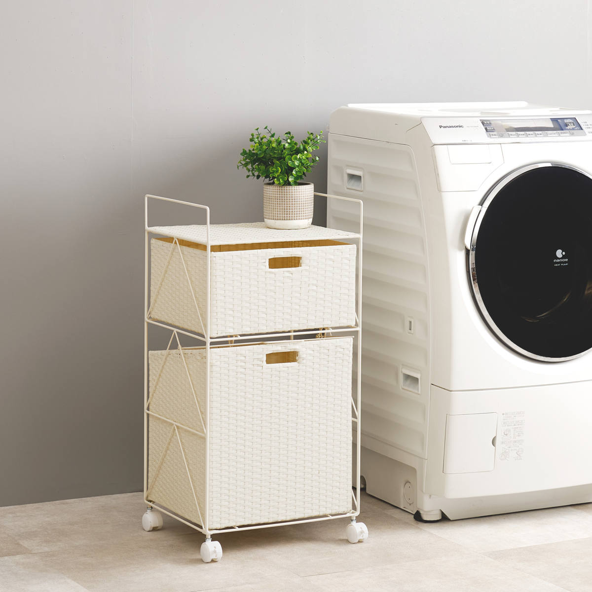 用途にわけて使える2段の引出し。上段にはタオルや洗剤のストック、下段はランドリーバスケットとしてお使いいただけます。取手付きで、取り外して持ち運びができるので洗濯物を干す時に便利です。