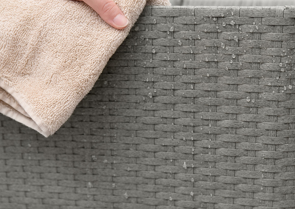 水に強い樹脂素材を編み込んだラタン調のデザインで、通気性に優れています。サッと拭き上げるだけで簡単にお手入れができるので、水回りでも活躍します。天然素材特有の節やささくれがなく、大切なお洋服やタオルを引っ掛けて傷付けにくいので安心です。
