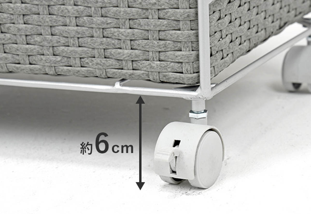 模様替えやお掃除の際に便利なキャスター付きです。4個のうち、2個はストッパー付きで、動かす必要がない時には固定しておくことも可能。高さ約6cmで、体重計の定位置にも。