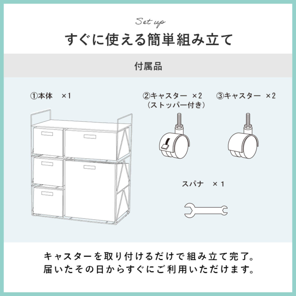 付属の工具でキャスターを取り付けるだけで、すぐにお使いいただけます。ほとんど完成した状態で届くので、組み立て家具や工具を扱うのが苦手な方にもおすすめです。